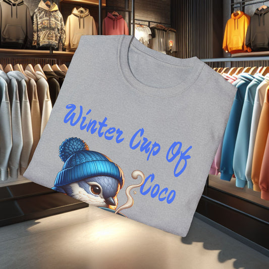 Blue Bird With a Cup Of Coco Unisex T-Shirt - Winter Coco