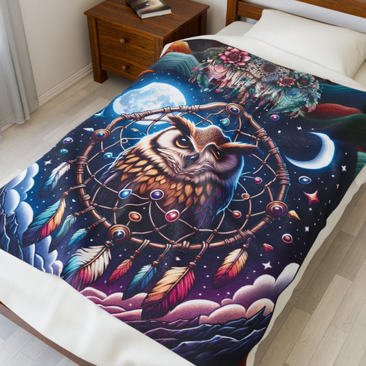 Brown Owl Dreamcatcher Velveteen Plush Blanket — Cozy Owl Throw
