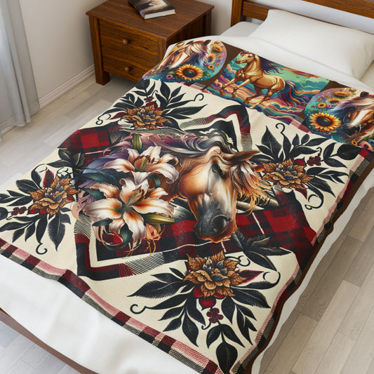 Tan Horse Velveteen Plush Blanket – Tan Horse with Flowers Cozy Western Throw