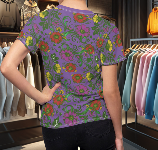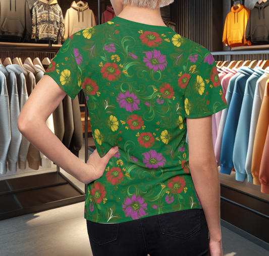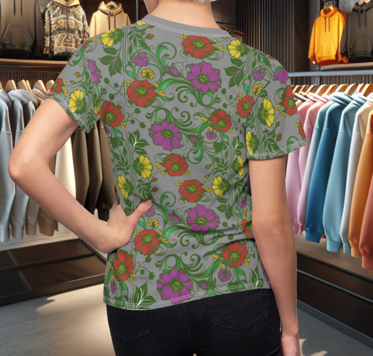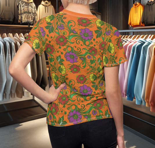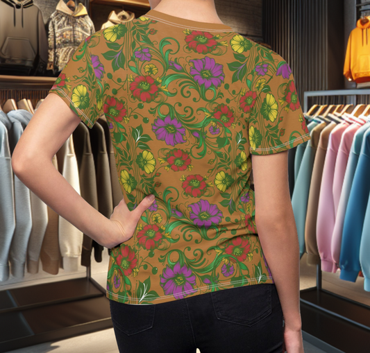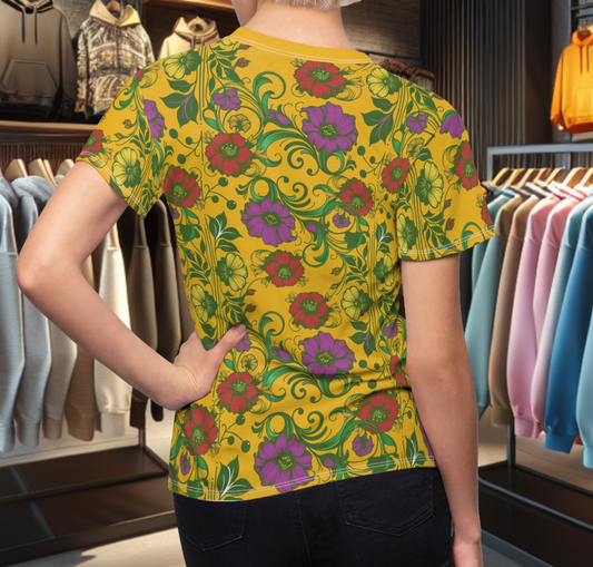 Floral Women's Tee - chicken in the Library - Yellow Background