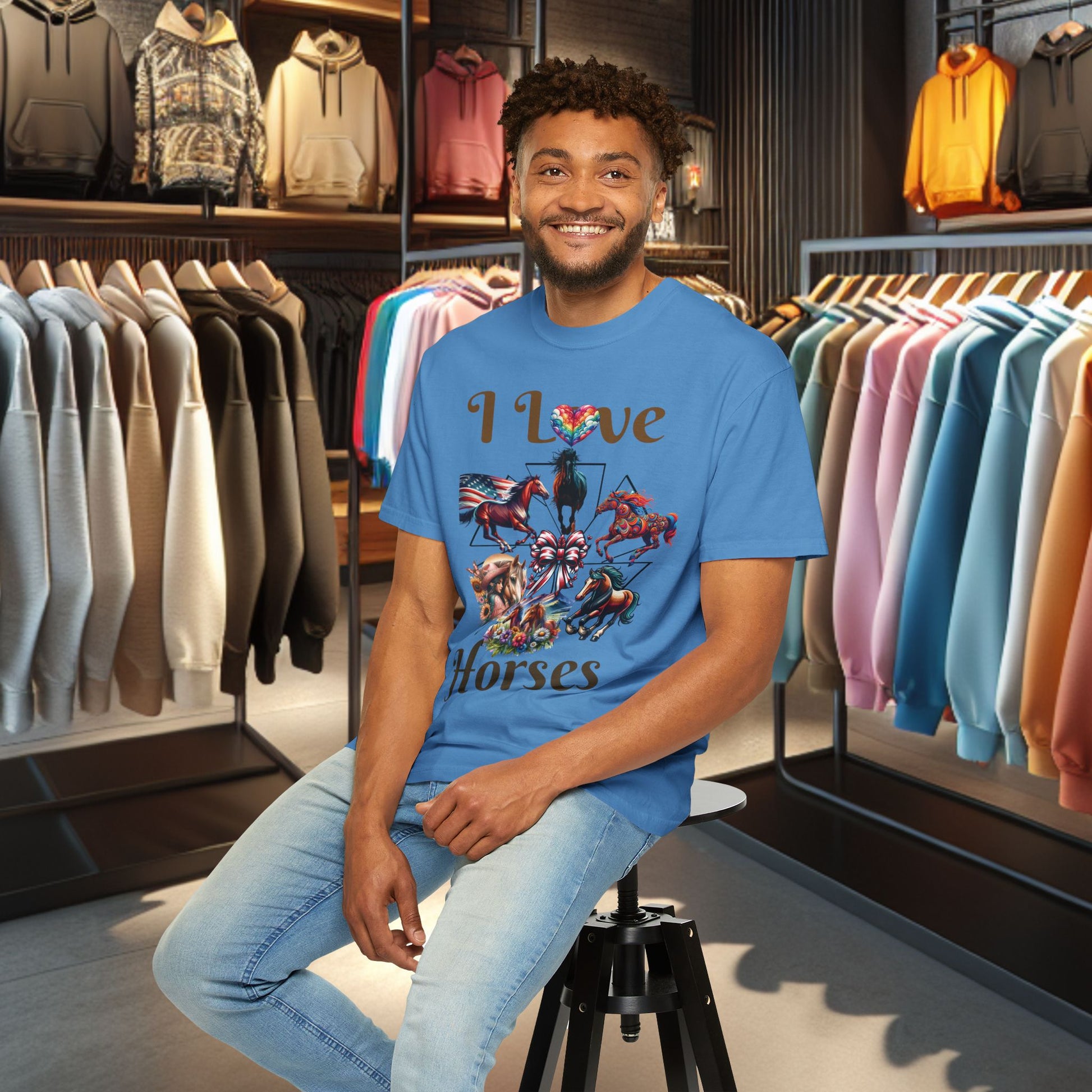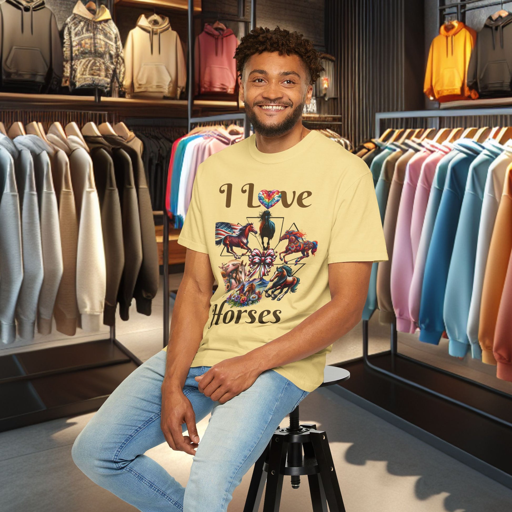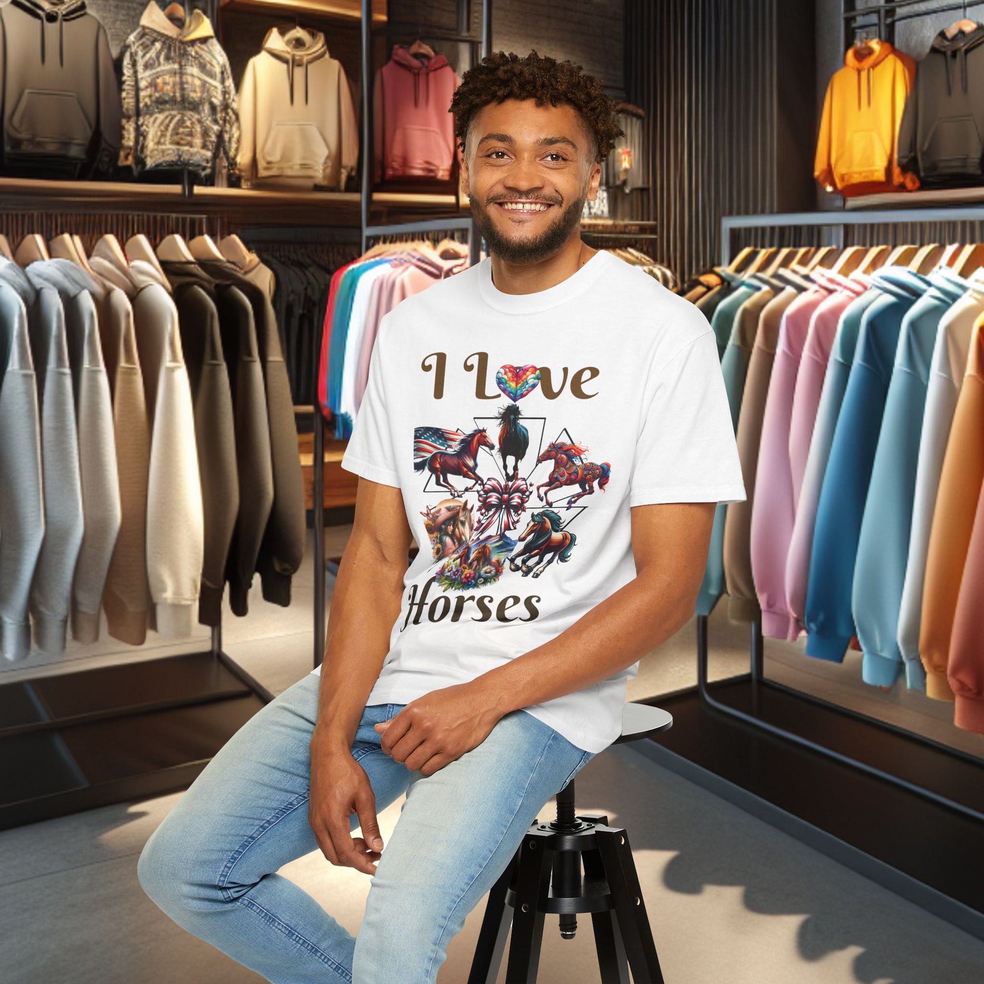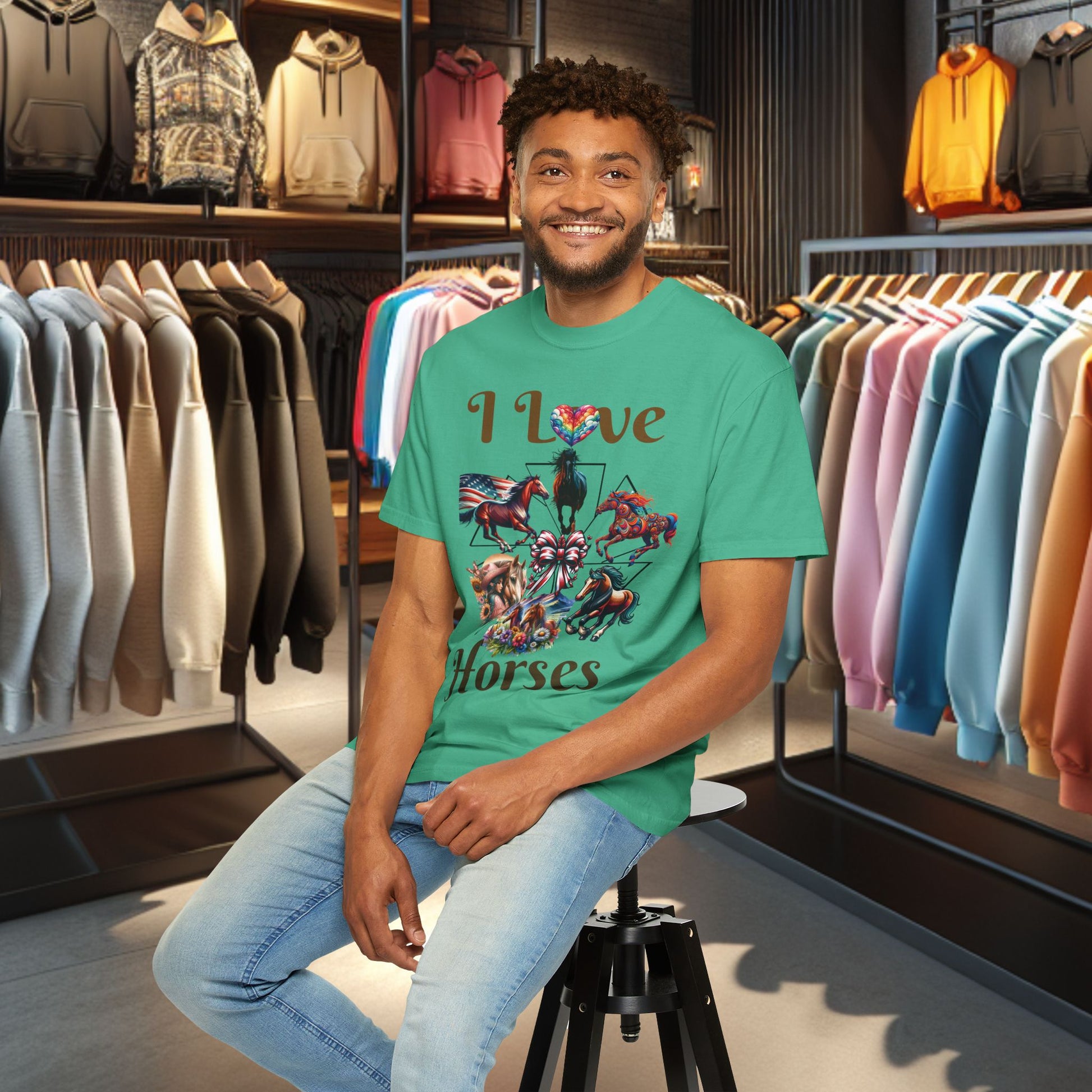 Boho Style I Love Horses T-shirt - perfect for horse lovers who appreciate a bohemian touch. This relaxed fit, unisex garment-dyed t-shirt is made of 100% cotton for long-lasting comfort. The unique design gives a free-spirited vibe, ideal for casual wear or horse-related events and gatherings. Available in sizes S to 4XL and in 58 different colors, this t-shirt is a must-have for any horse enthusiast.
