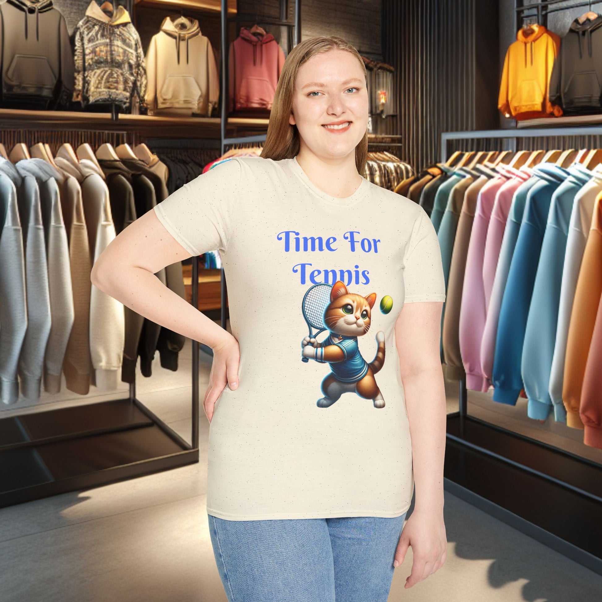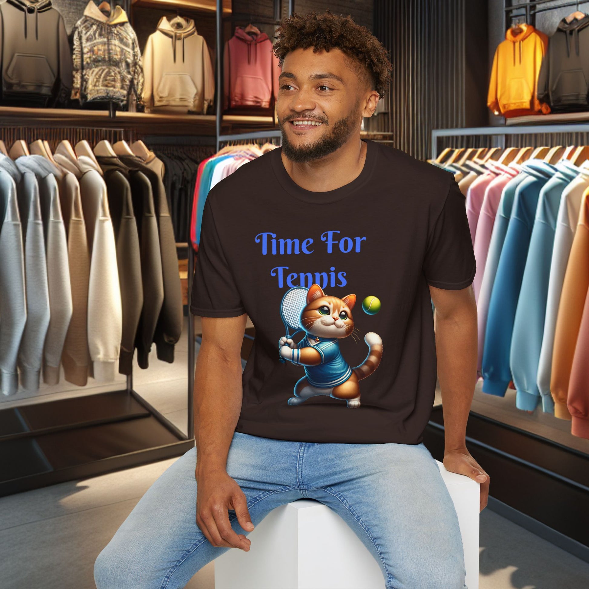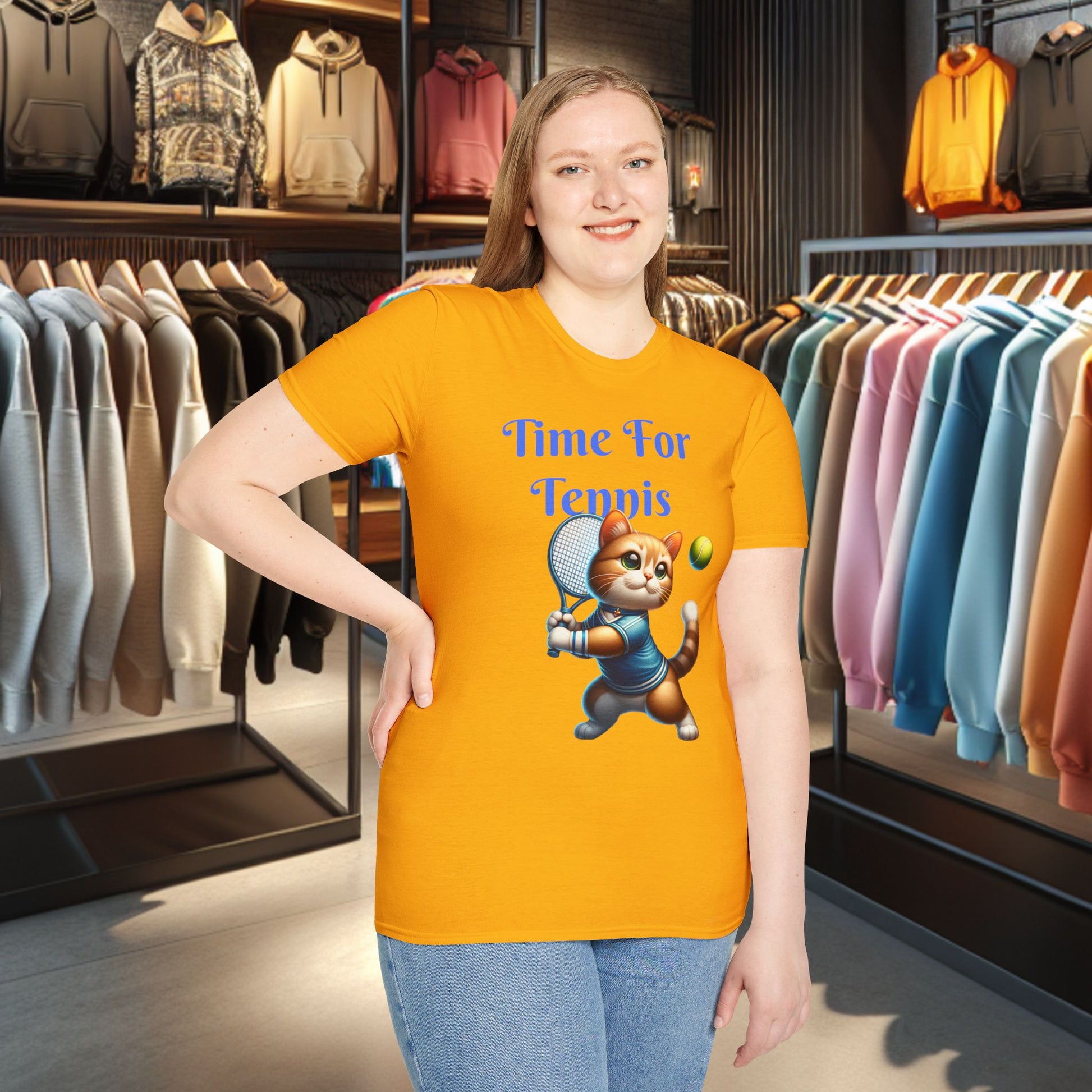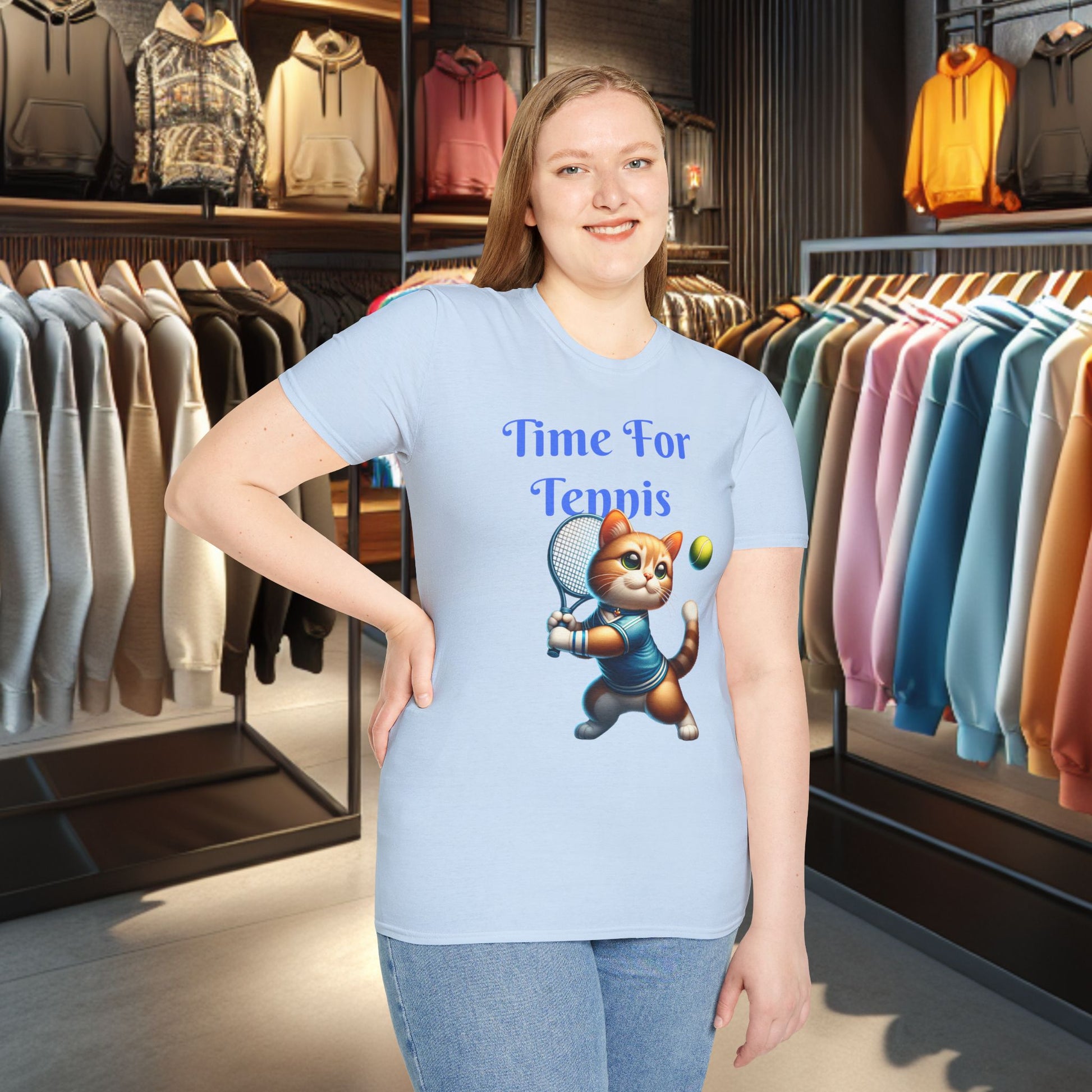 Cat Playing Tennis Unisex T-Shirt - Time For Tennis. This T-Shirt gives a fun and sporty vibe, perfect for tennis enthusiasts or anyone looking for a playful design. It's suitable for adults and can be worn casually or during tennis matches. Ideal for tennis tournaments, sports events, or casual wear.