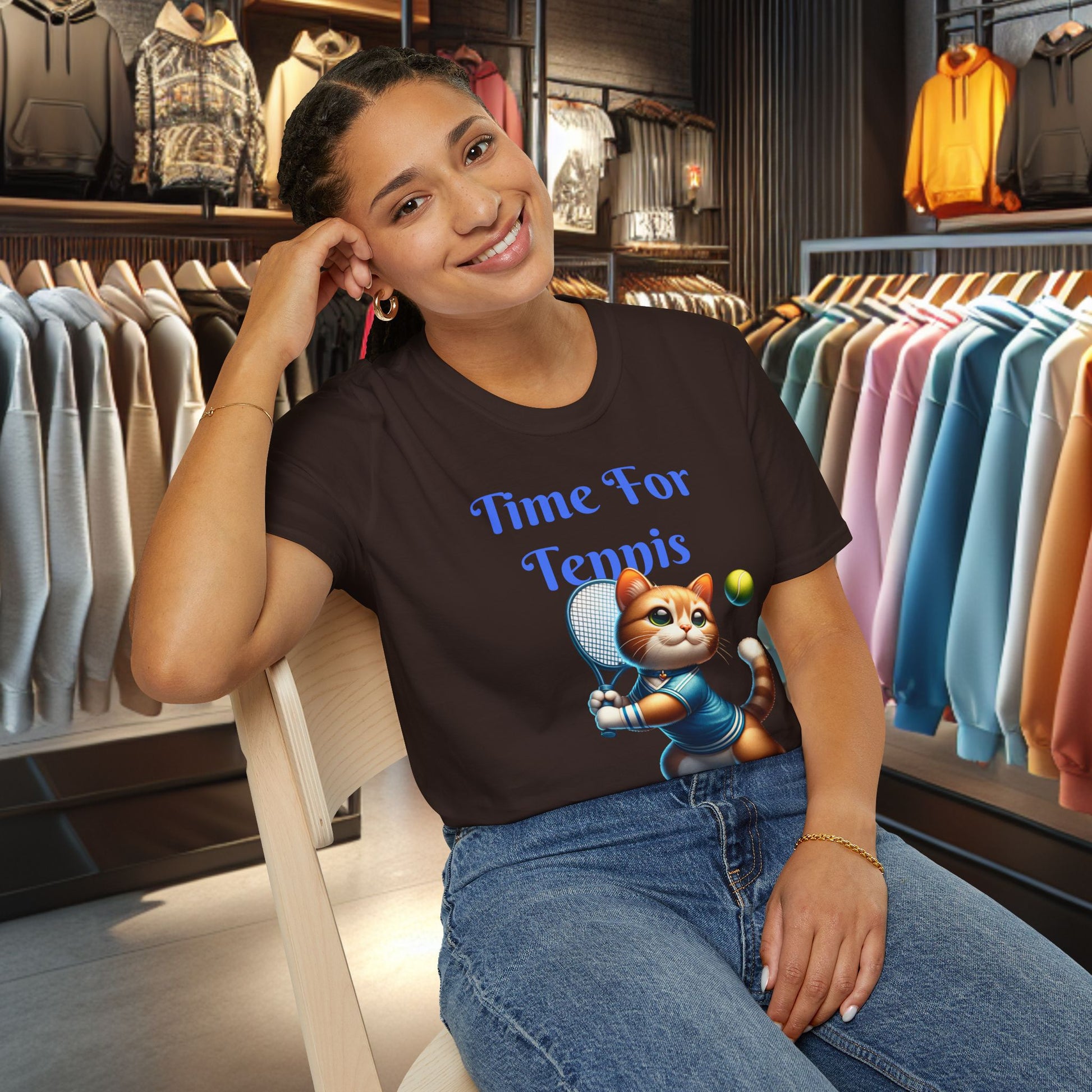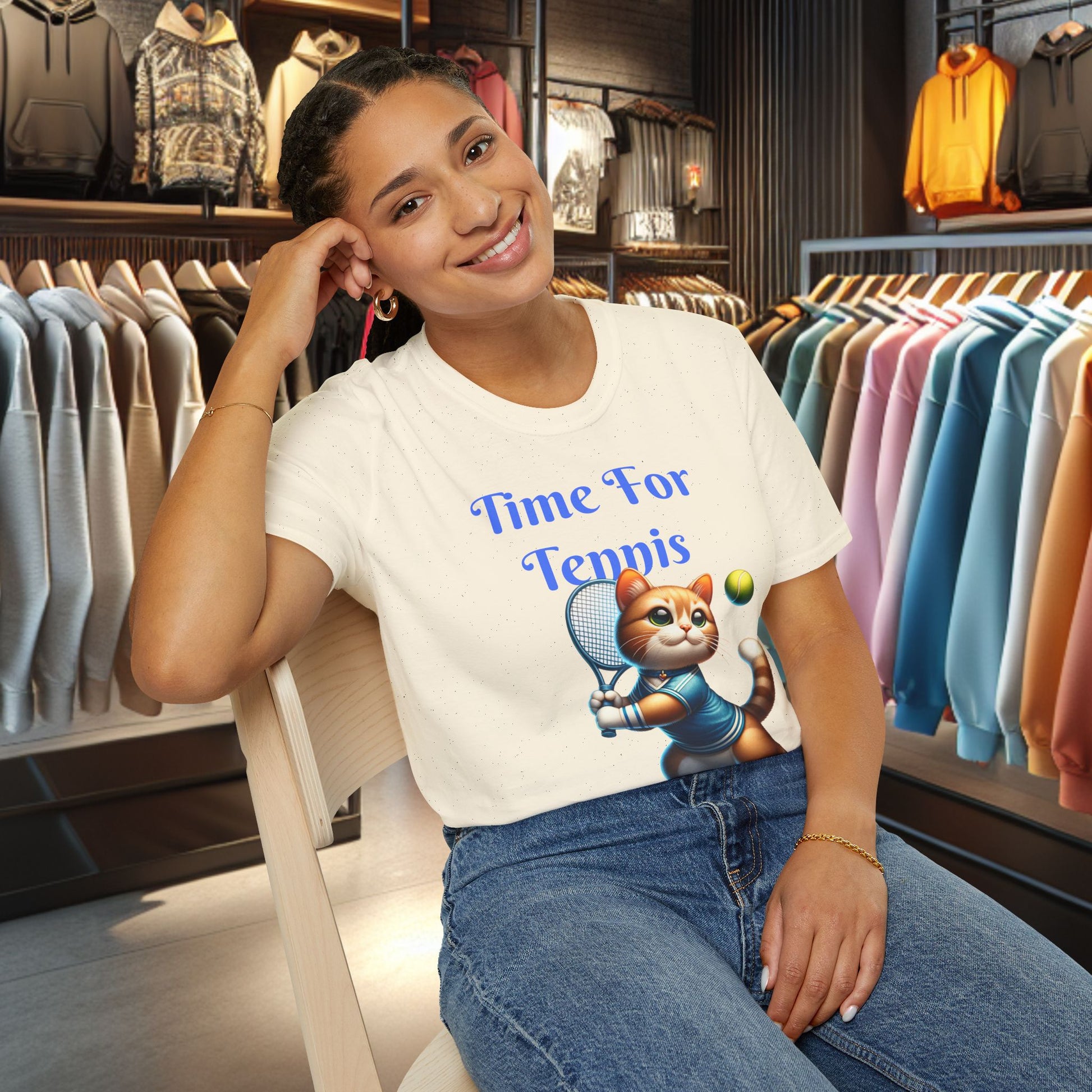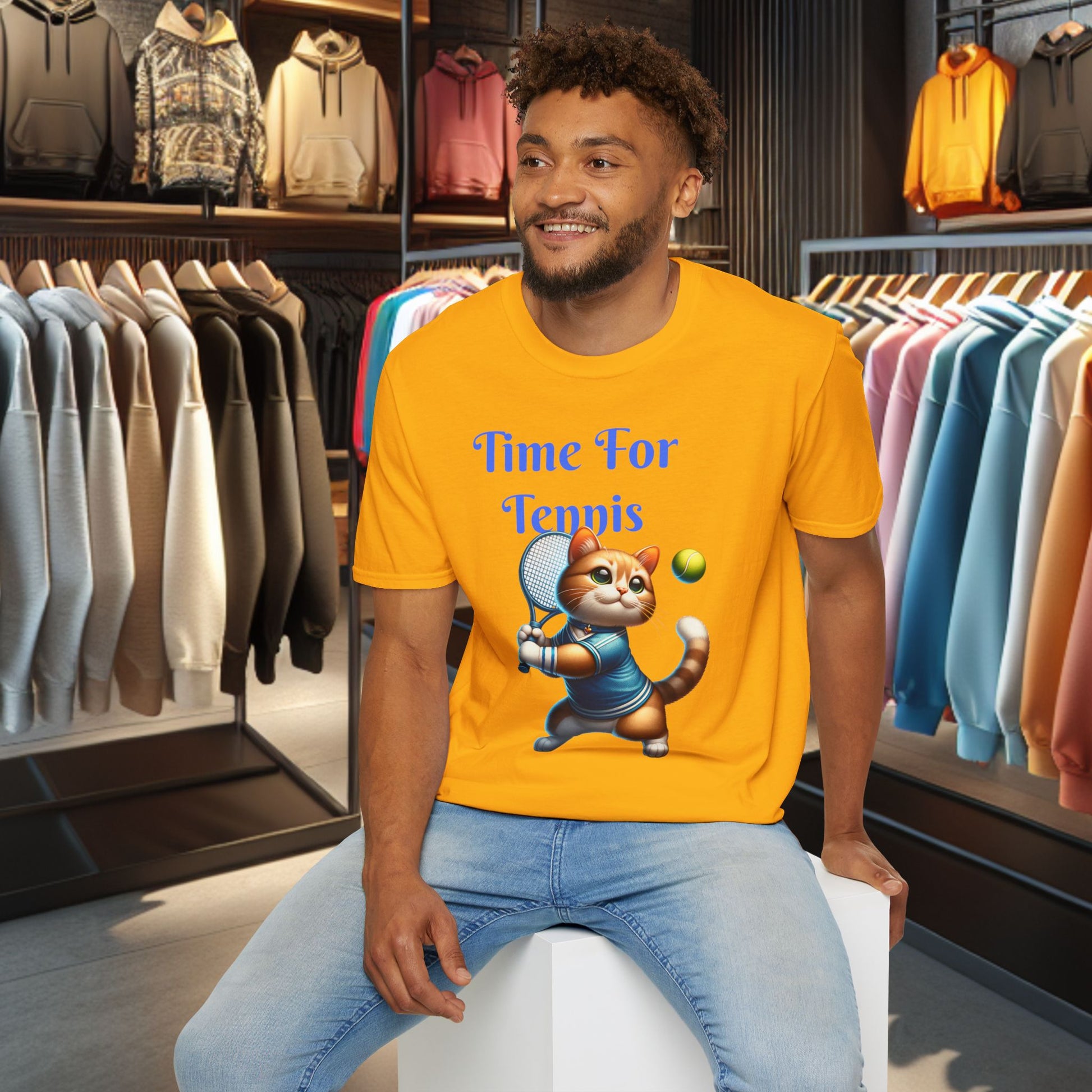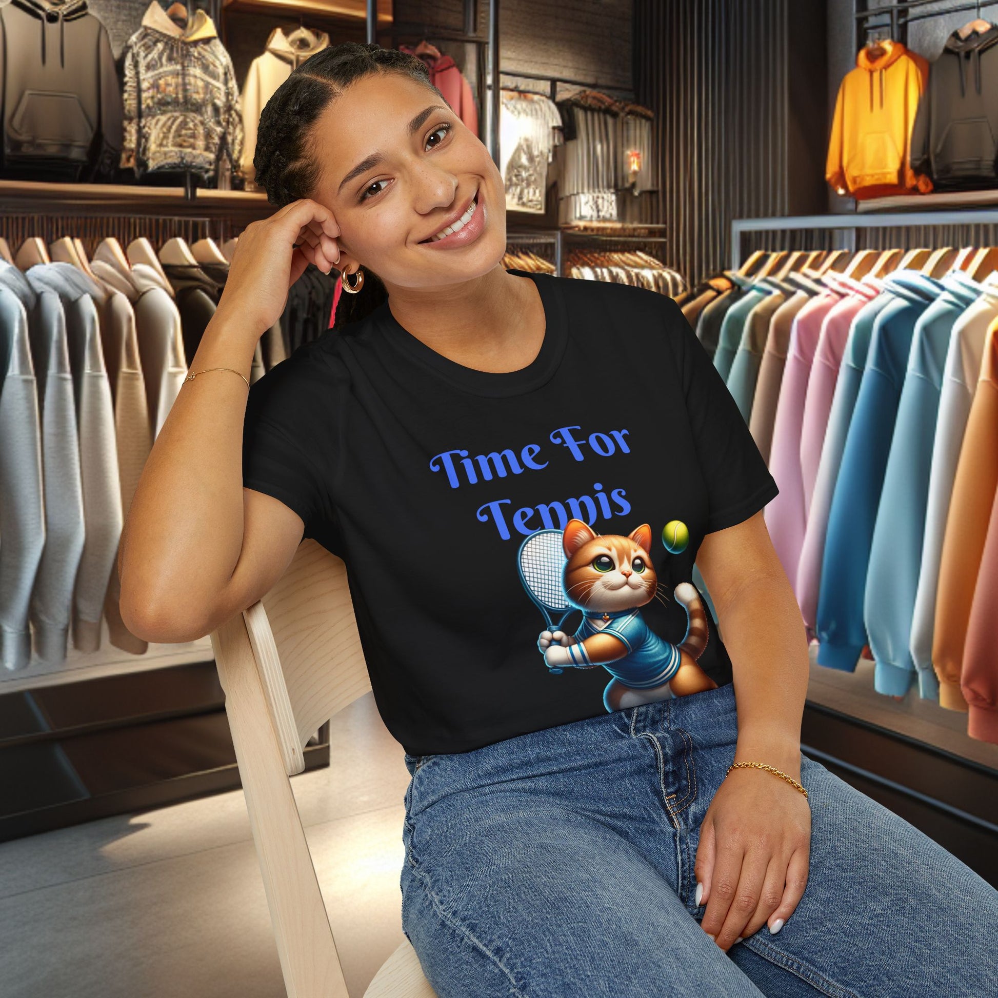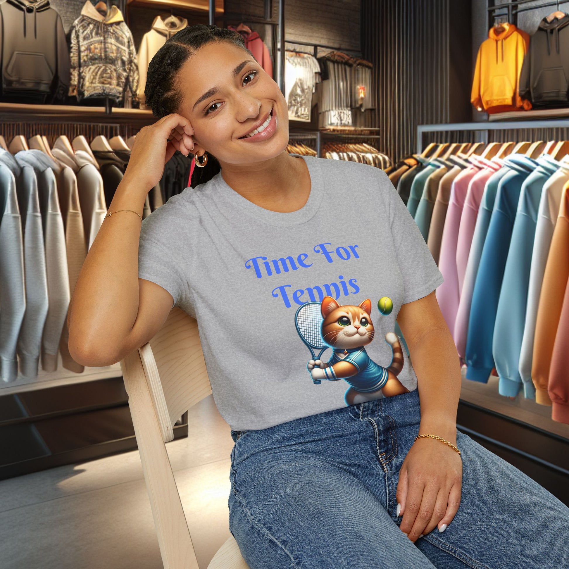 Cat Playing Tennis Unisex T-Shirt - Time For Tennis. This T-Shirt gives a fun and sporty vibe, perfect for tennis enthusiasts or anyone looking for a playful design. It's suitable for adults and can be worn casually or during tennis matches. Ideal for tennis tournaments, sports events, or casual wear.