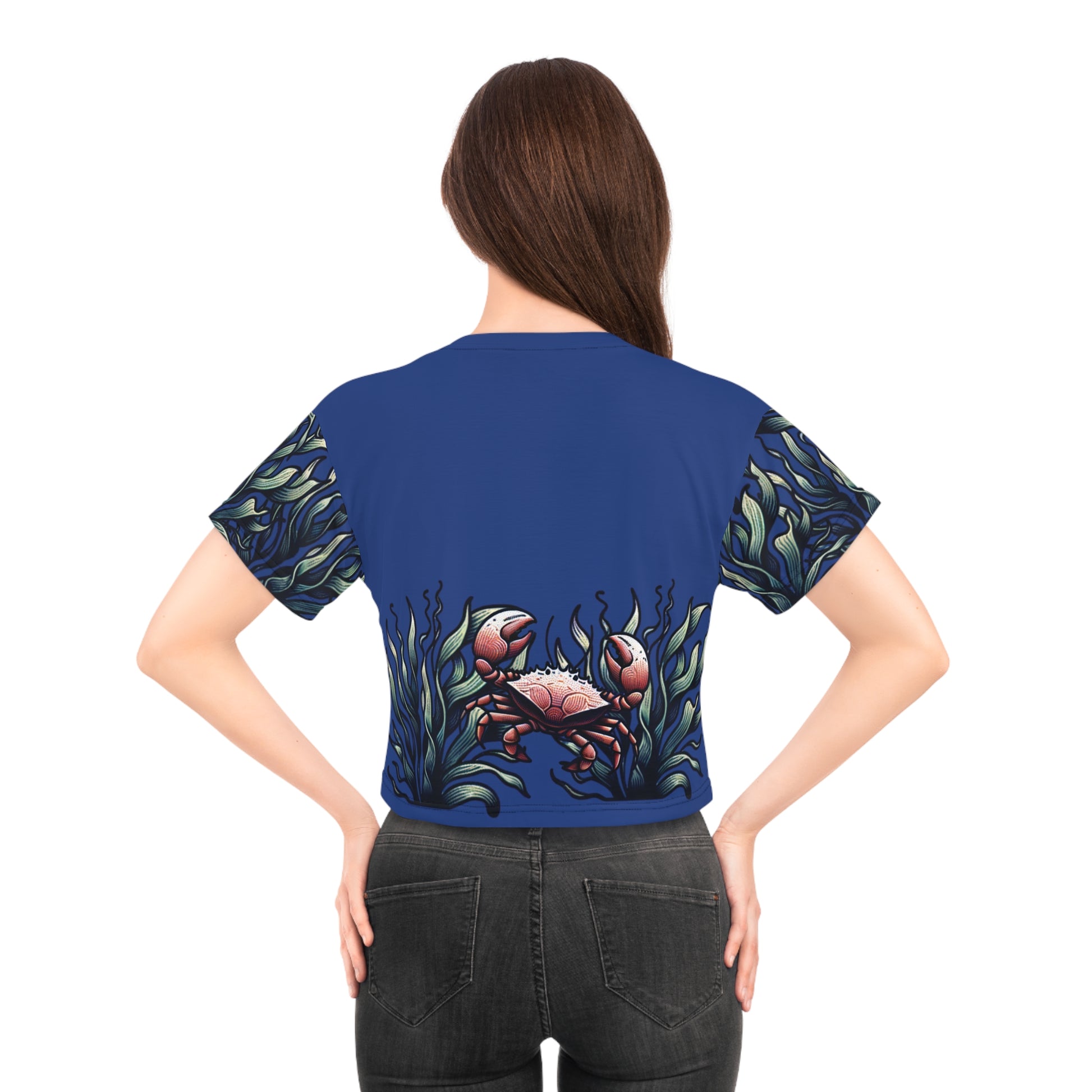 A vibrant and playful Women's Crop Tee featuring dolphins at play. Made from 100% polyester for durability and quick drying. Perfect for those who love marine life and want to add a fun and colorful piece to their wardrobe. Ideal for beach trips, summer outings, and marine life enthusiasts.