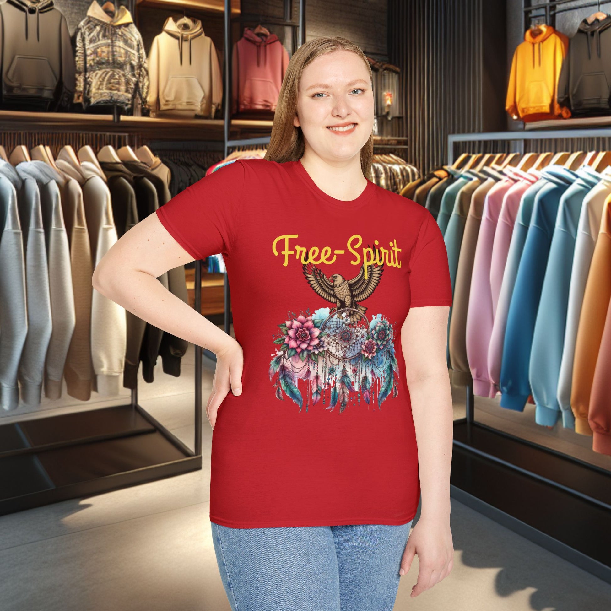 The Unisex Softstyle T-Shirt featuring a dream catcher and an eagle design exudes a bohemian and free-spirited vibe. This versatile tee can be worn casually or dressed up, making it perfect for anyone looking to catch their dreams. Ideal for adults, this shirt is made with durable and smooth fabric, perfect for printing. It is relevant for holidays, festivals, and everyday wear.