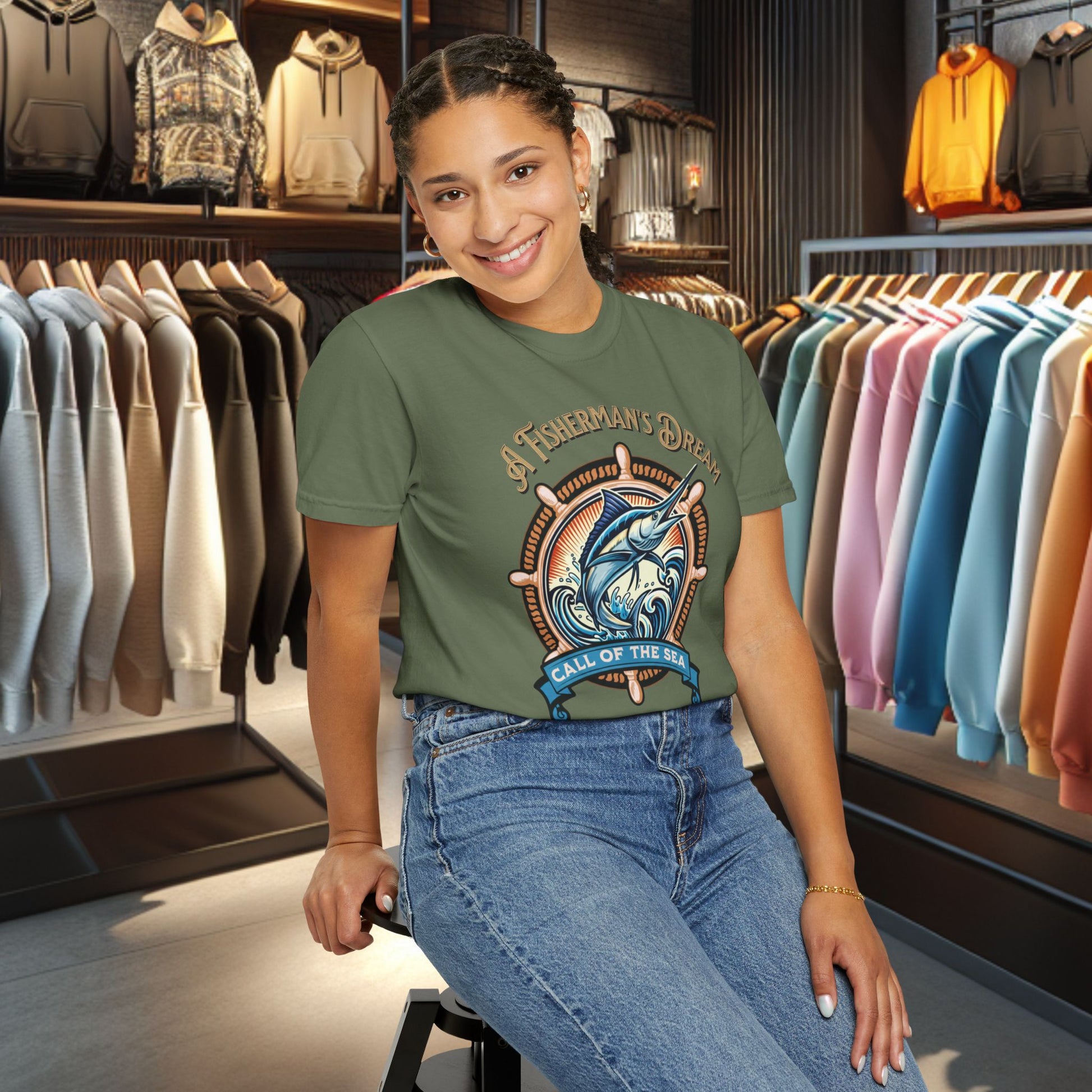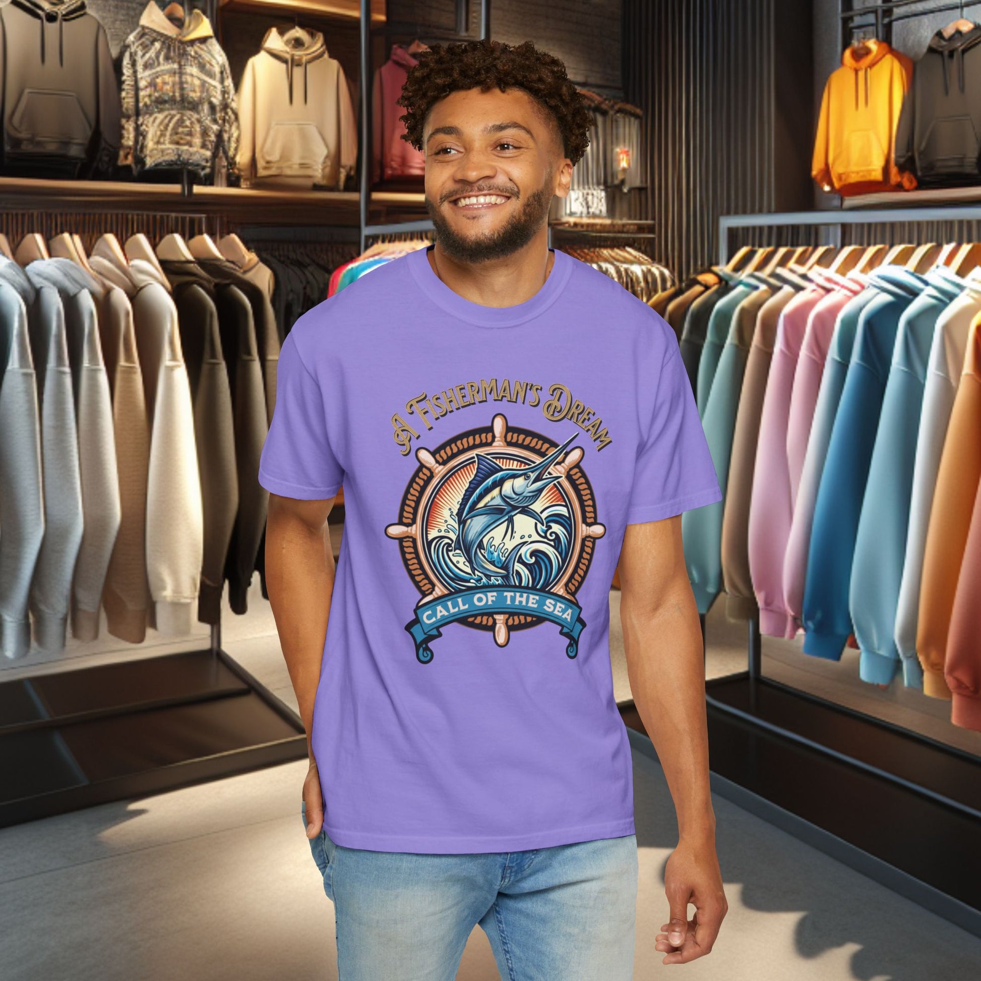 Salt air on your skin, the creak of a wooden dock, the hush before the day’s first catch — this Fisherman’s Dream tee carries that calm. The garment-dyed cotton settles into a lived-in feel and soft sea-washed hue that ages like a favorite memory. Wear it on early mornings hauling pots of coffee to the boat, on slow afternoons mending lines, or tucked into a harbor-side pub as the tide comes in. The relaxed fit and substantial, heavyweight knit sit comfortably over layers while double-stitched seams stand up to hard work and long seasons. It’s straightforward, durable, and quietly nautical — a shirt that looks at home wherever the horizon meets the water.
