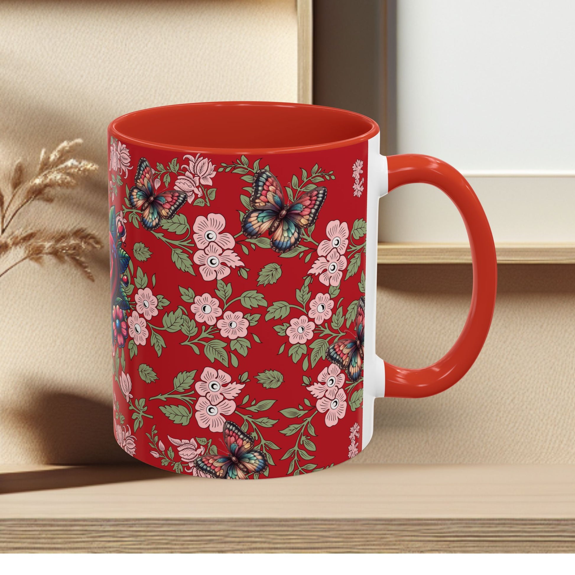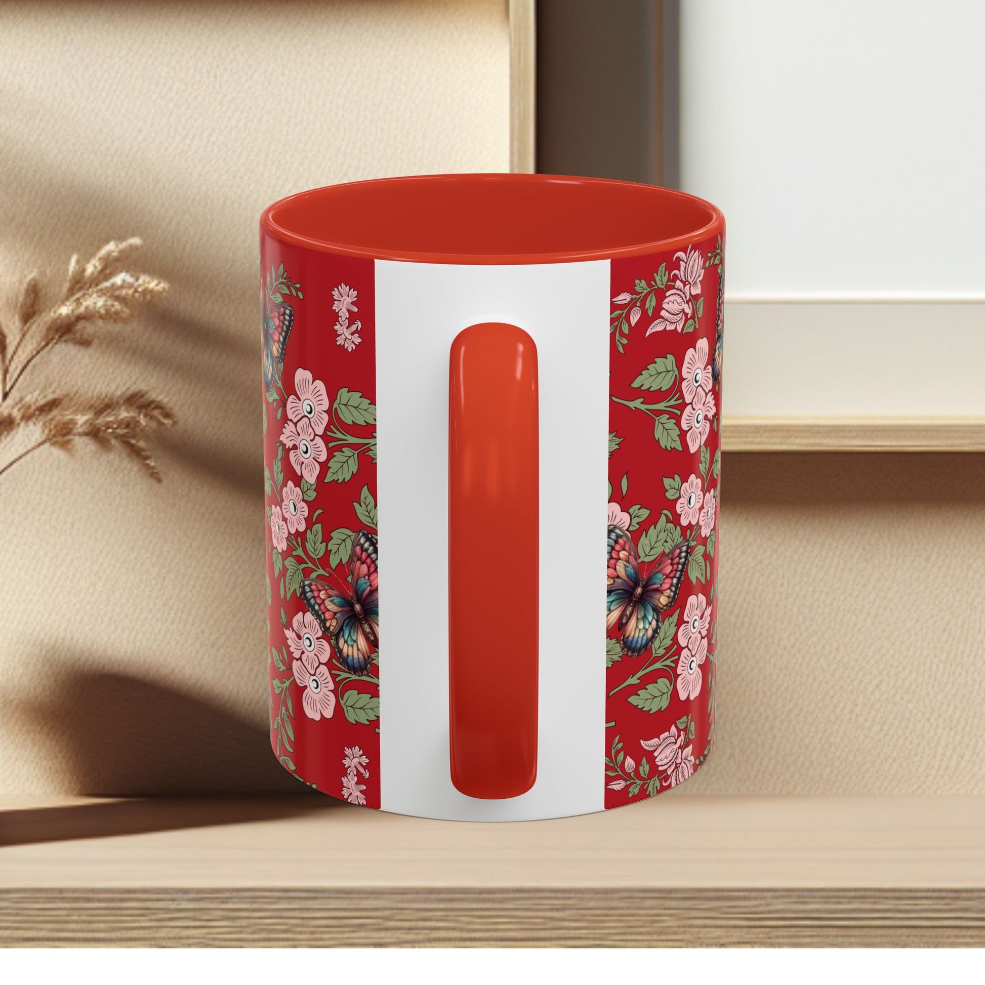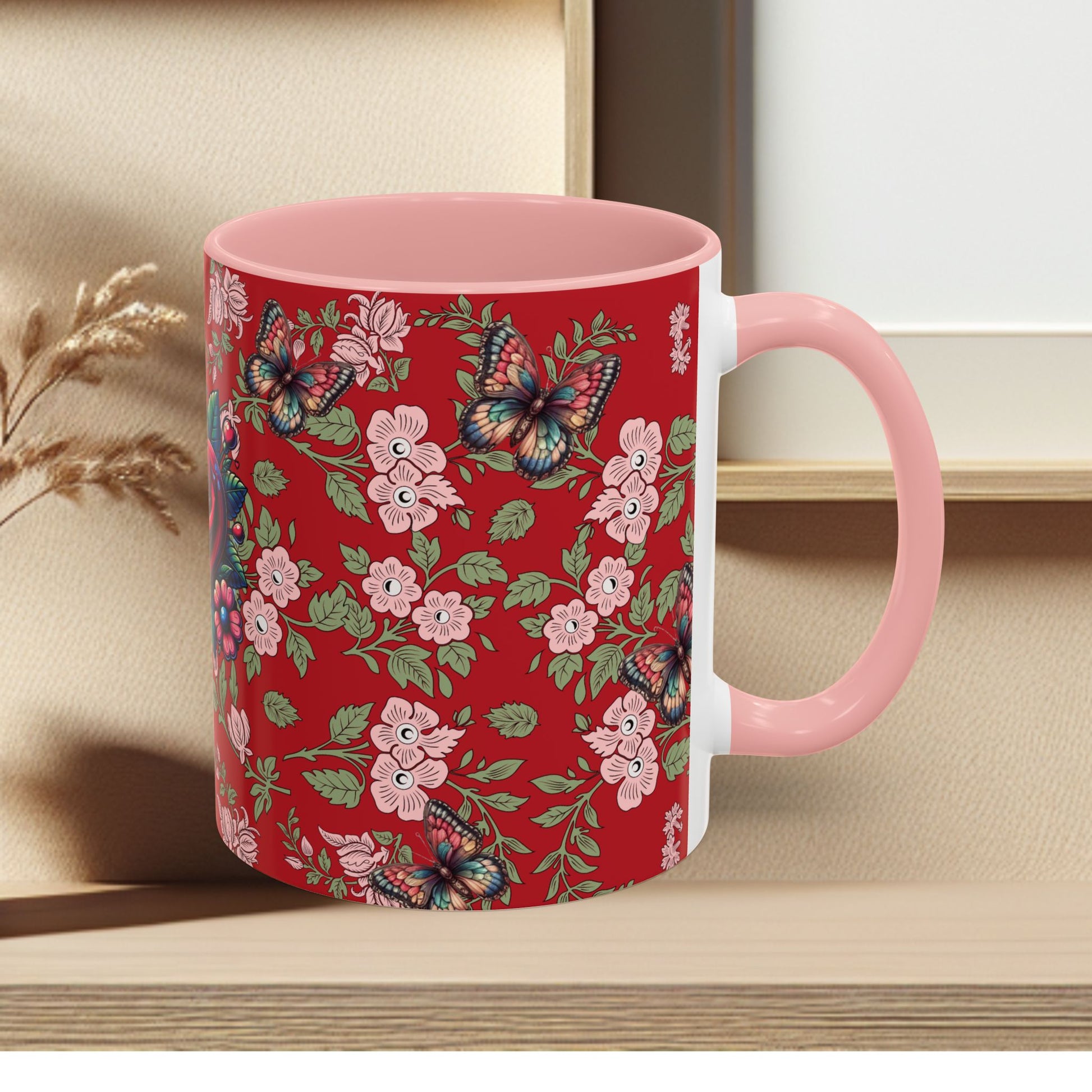 A charming red mug featuring pink flowers, butterflys, and a red rose heart design. This vibrant and eye-catching mug is perfect for enjoying your morning coffee or tea. Ideal for those who love floral patterns and want to add a pop of color to their kitchen. Great for gifting on occasions like birthdays, Mother's Day, or as a thank you gift.