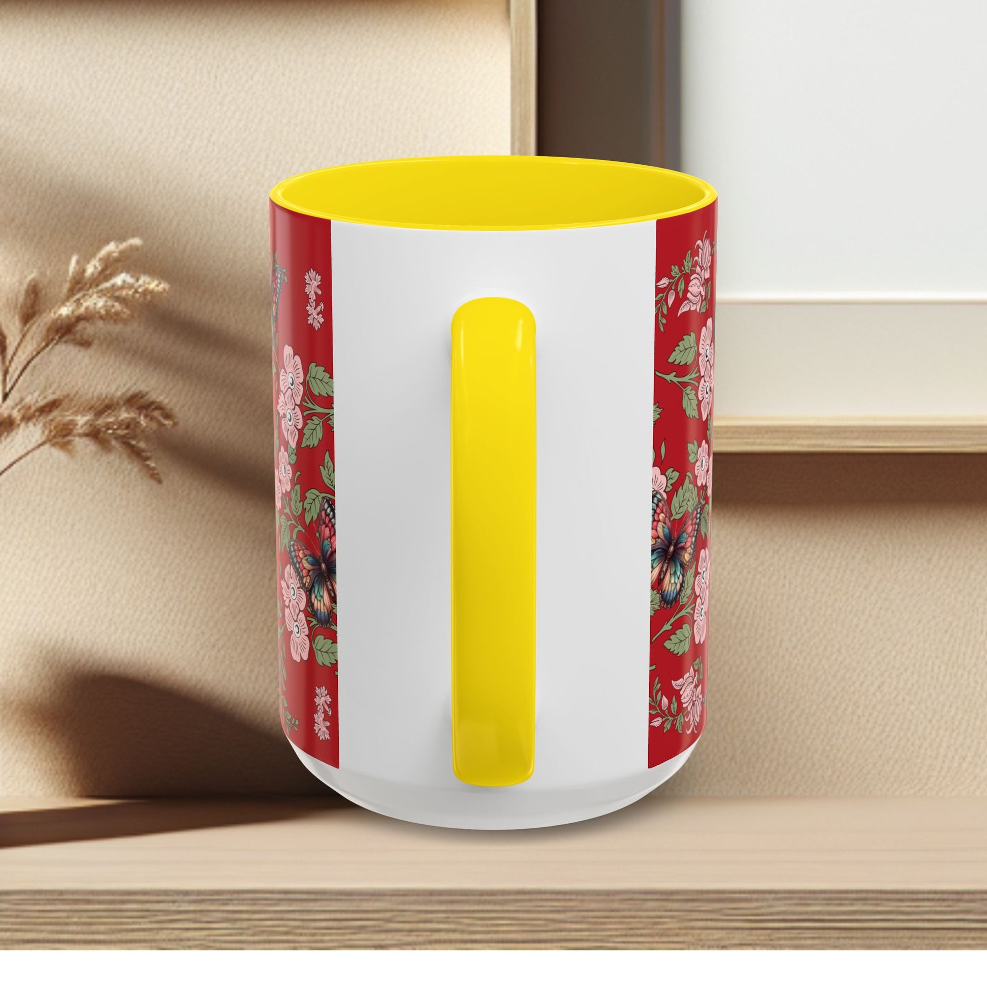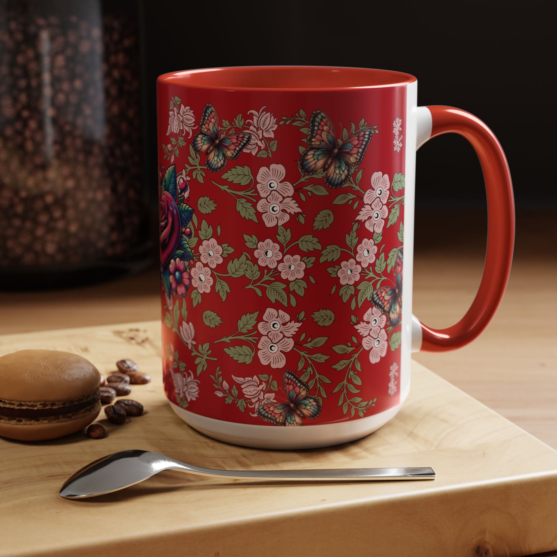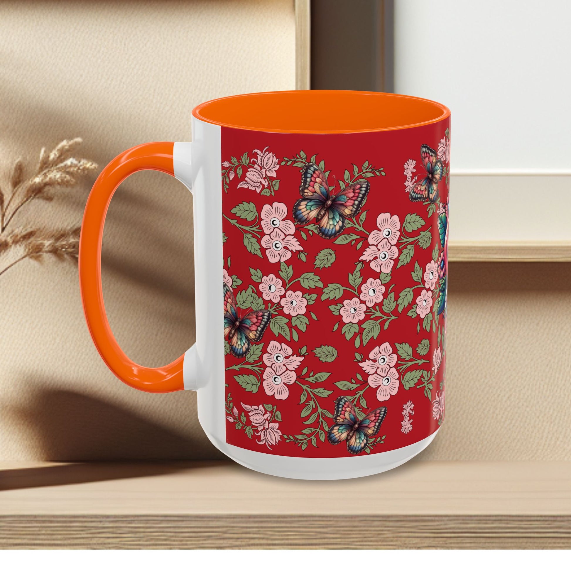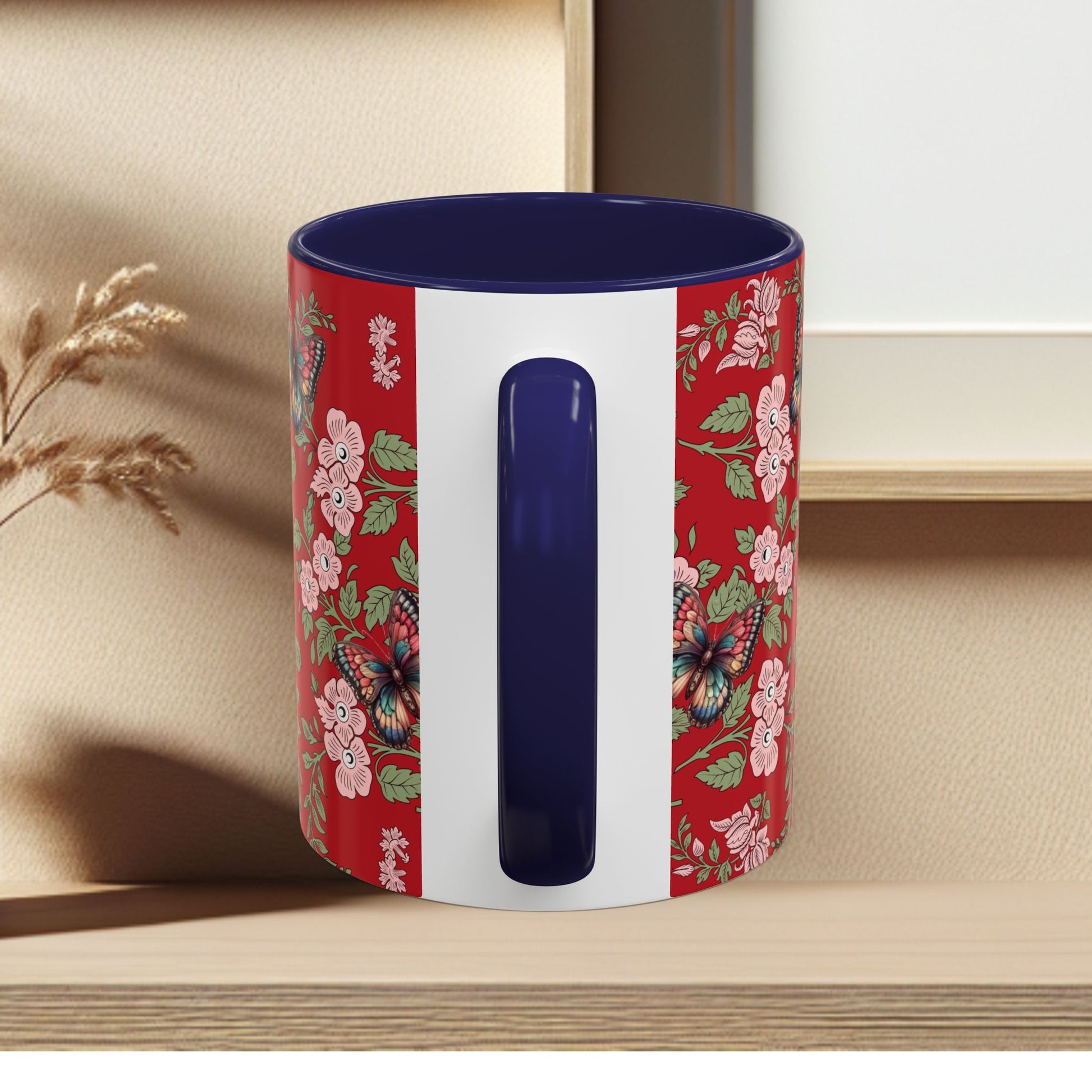 A charming red mug featuring pink flowers, butterflys, and a red rose heart design. This vibrant and eye-catching mug is perfect for enjoying your morning coffee or tea. Ideal for those who love floral patterns and want to add a pop of color to their kitchen. Great for gifting on occasions like birthdays, Mother's Day, or as a thank you gift.