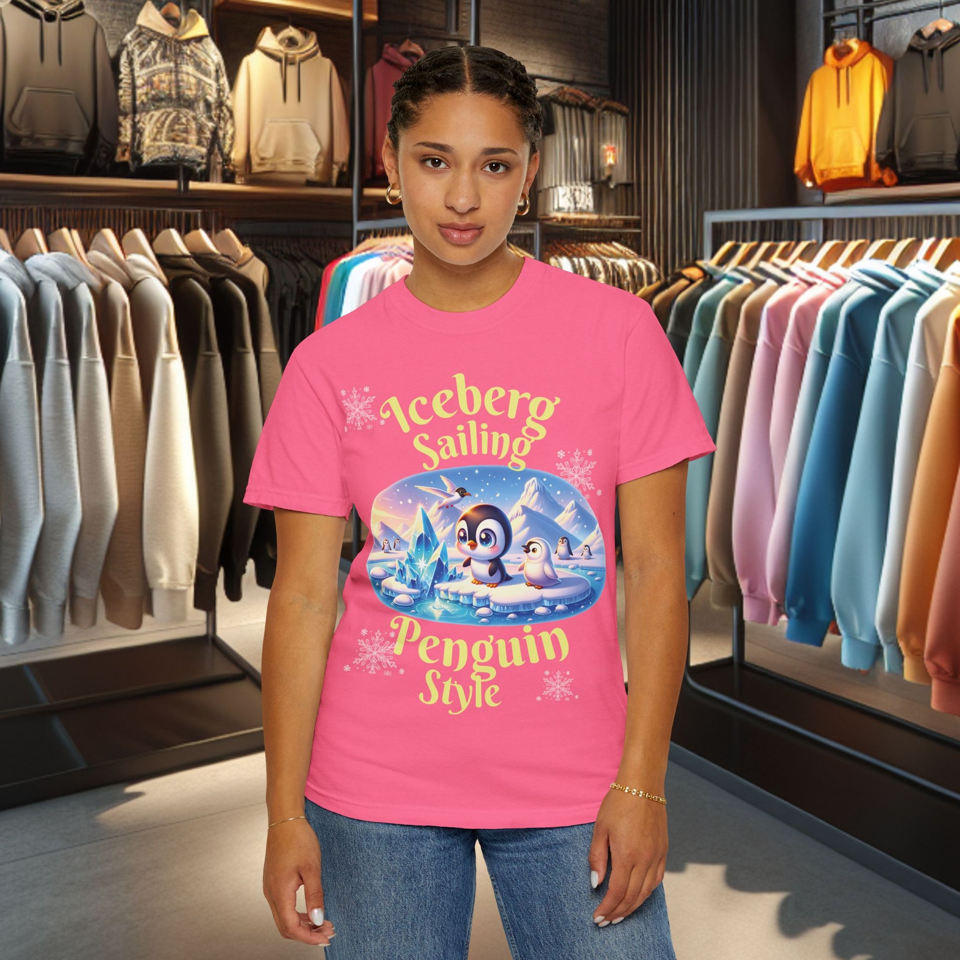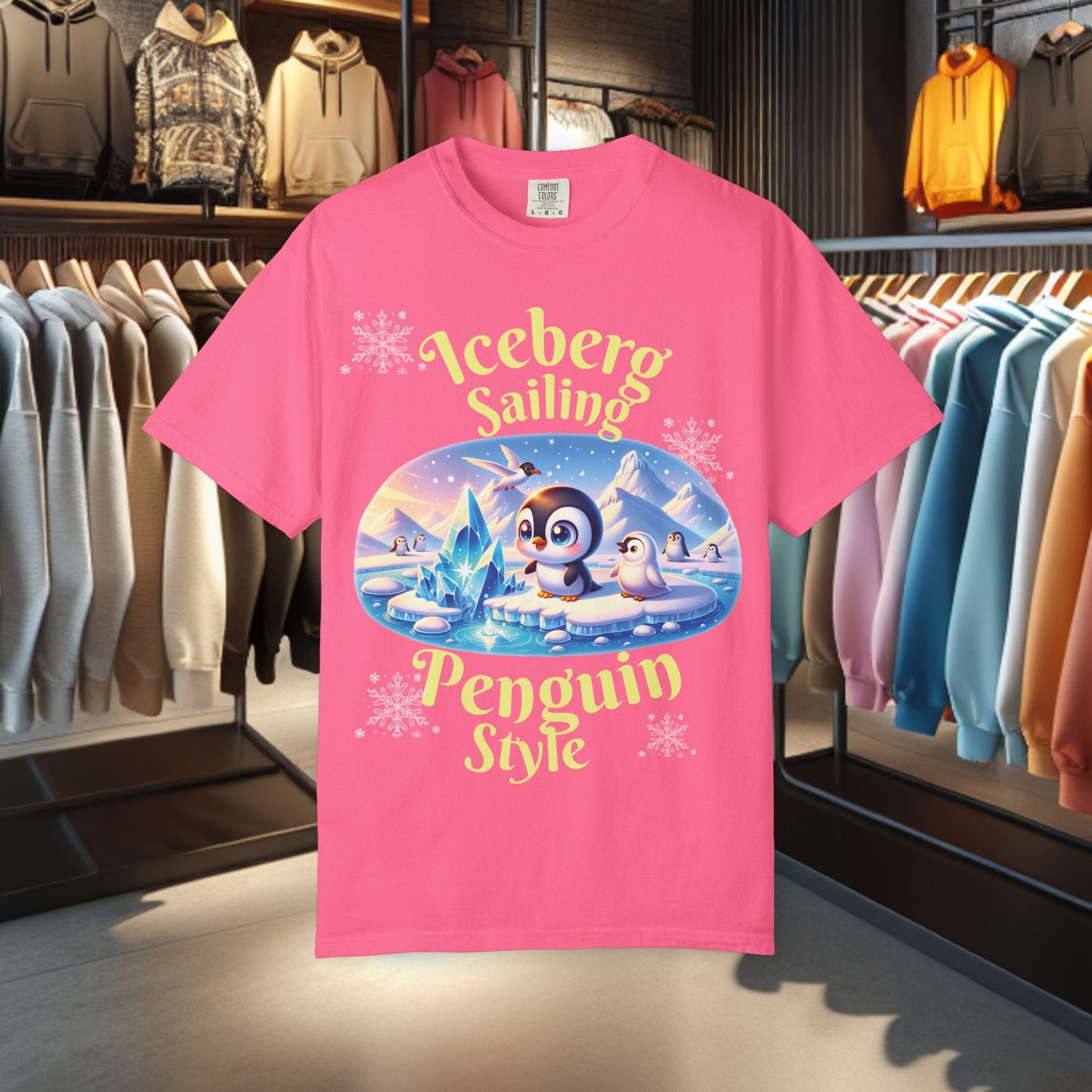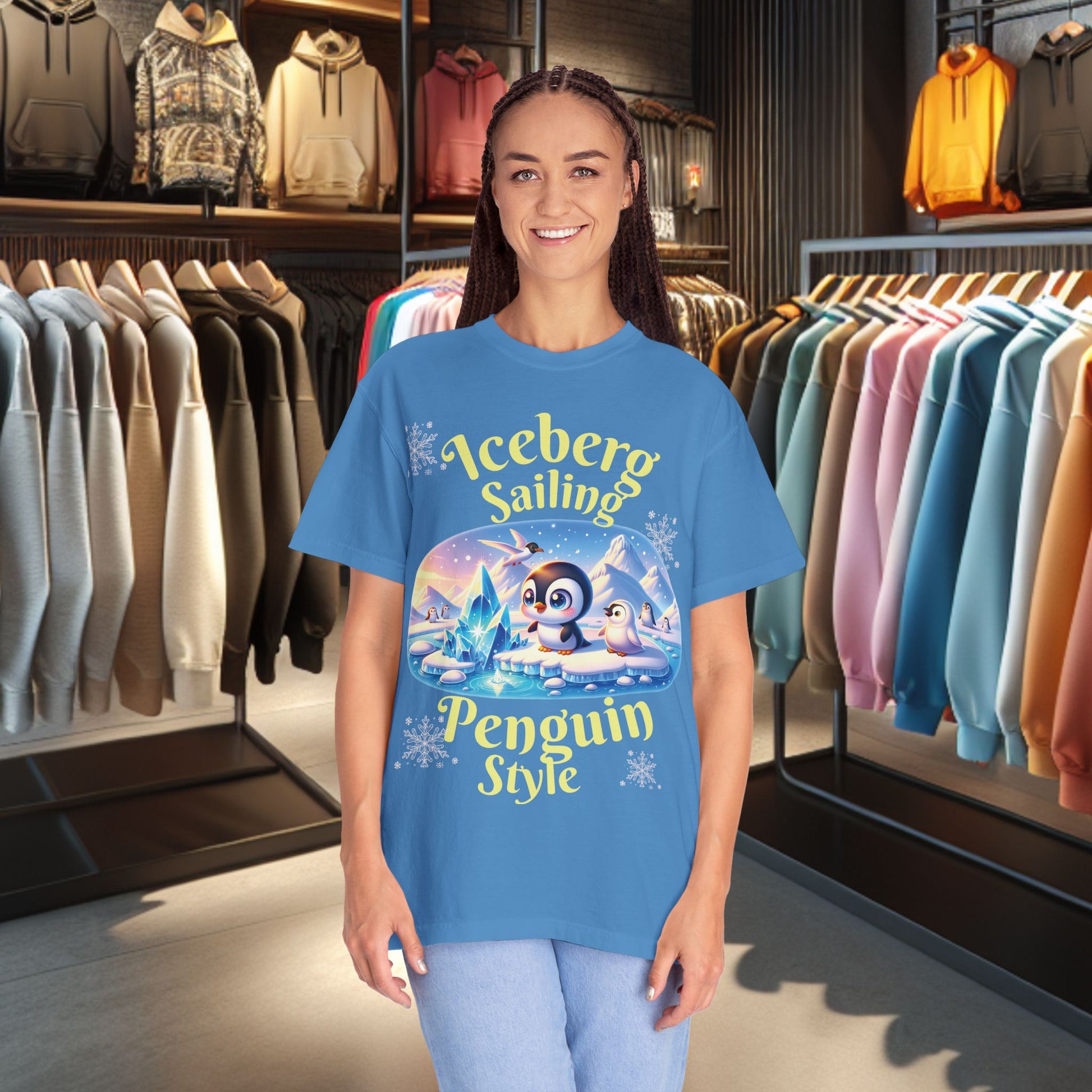 Stay festive and cute with this Iceberg Sailing Penguin T-shirt. Perfect for the holidays, this winter tee features a cute penguin design that will bring a smile to anyone's face. The garment-dyed fabric gives it a soft color and texture, and the relaxed fit ensures long-lasting comfort. Ideal for those who love holiday celebrations and want to add a touch of fun to their wardrobe.