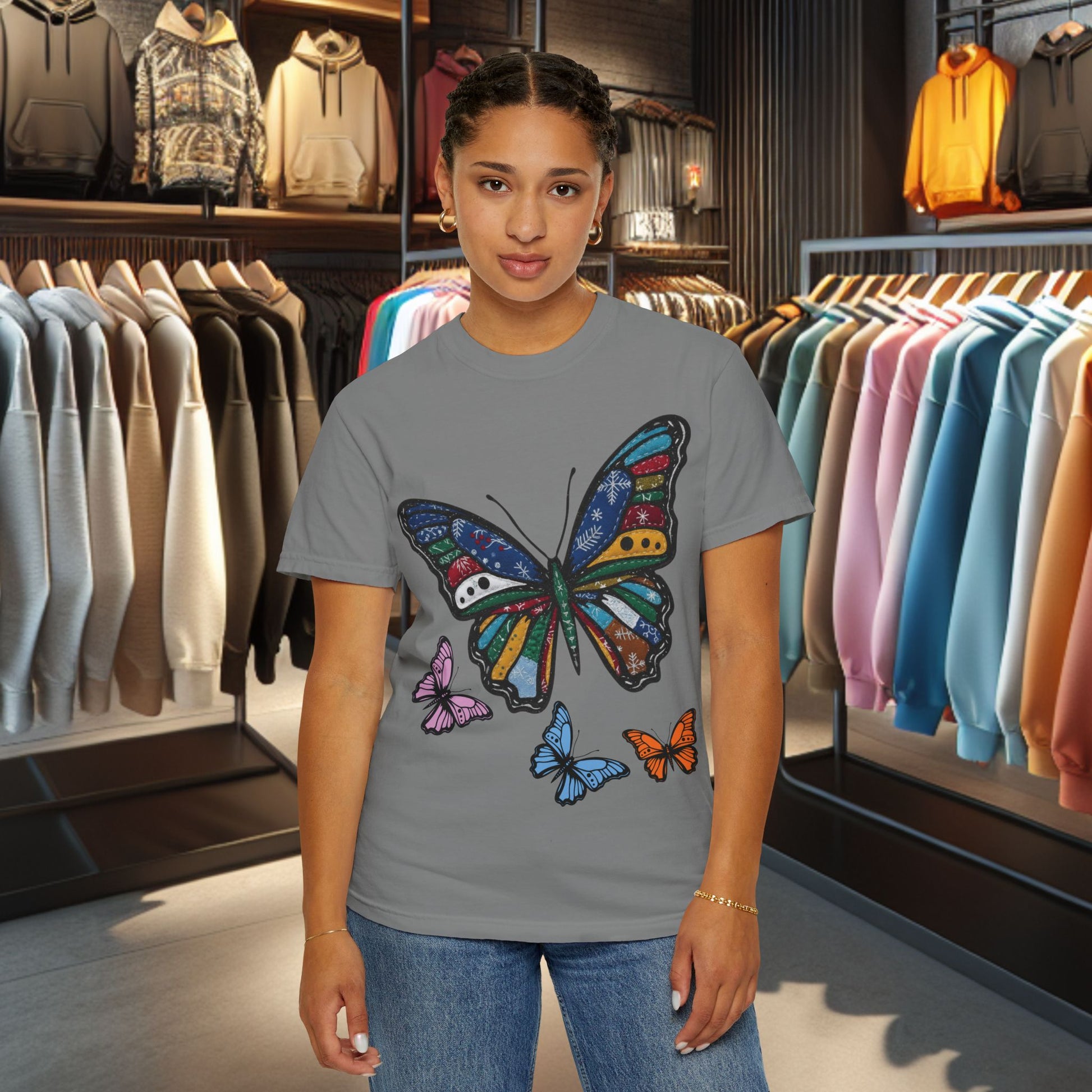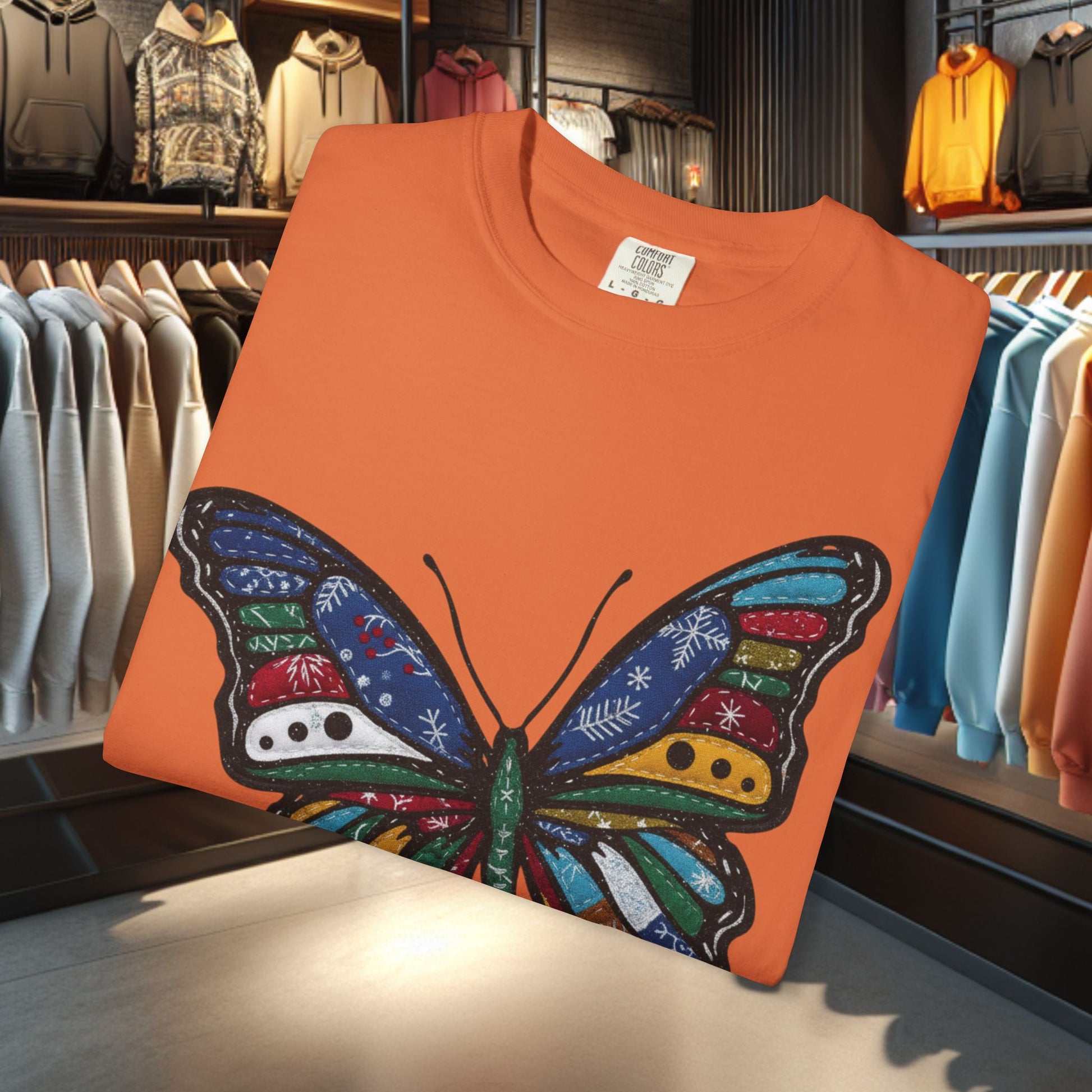 This garment-dyed tee carries a playful patchwork butterfly motif that feels like a small celebration stitched into your everyday wardrobe. The soft, lived-in color and relaxed fit invite you to pull it on for slow mornings at the market, impromptu backyard gatherings, or evenings around string lights. Lightweight but substantial, the shirt moves with you — the butterfly design adds a handcrafted, festive note without shouting. Slip it on with worn denim or layer it under a flannel; it sits comfortably in the rotation of someone who cares about texture, color, and subtle personality in clothing.