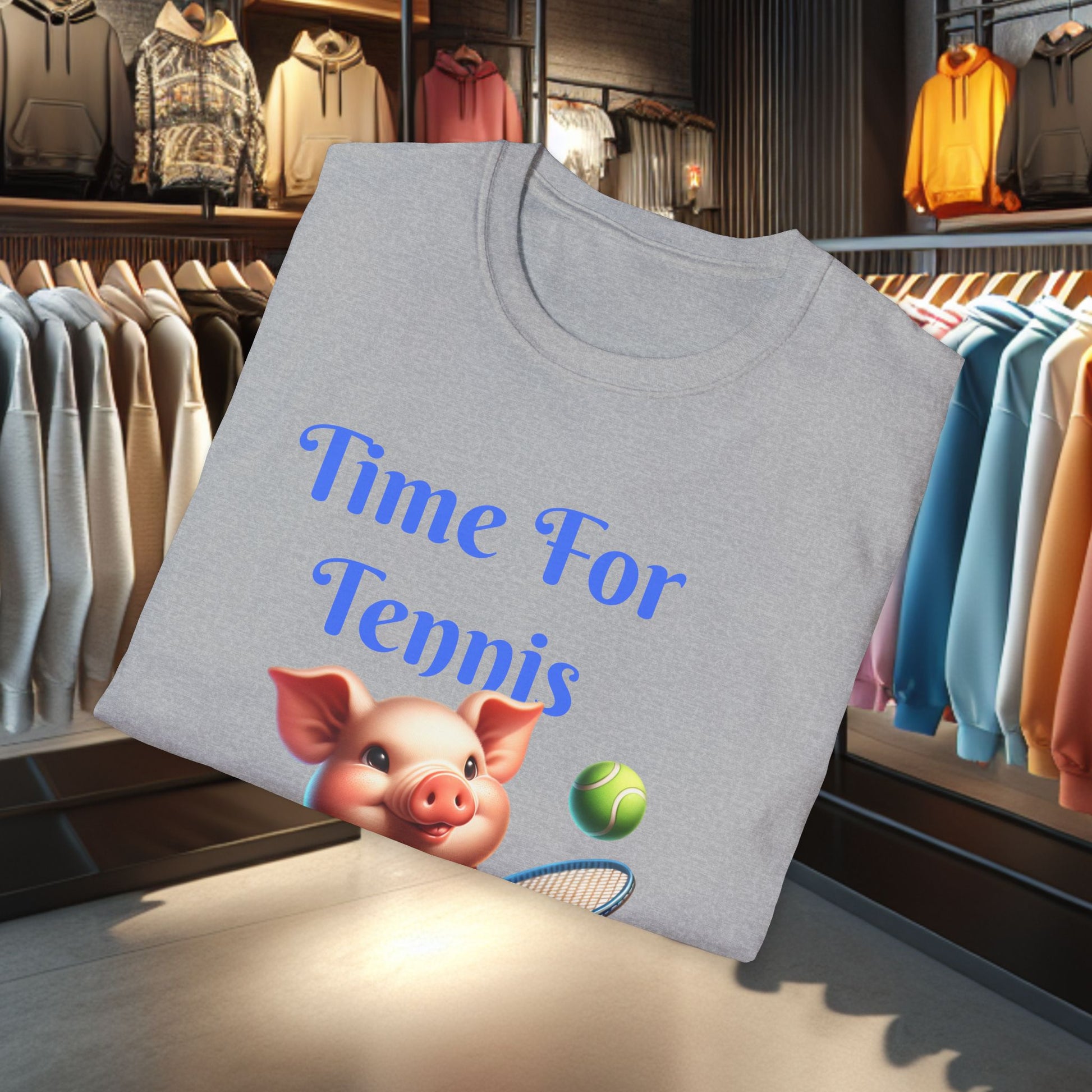 Pig Playing Tennis Unisex T-Shirt - Time For Tennis. This T-Shirt gives a fun and sporty vibe, perfect for tennis enthusiasts or anyone looking for a playful design. It's suitable for adults and can be worn casually or during tennis matches. Ideal for tennis tournaments, sports events, or casual wear.