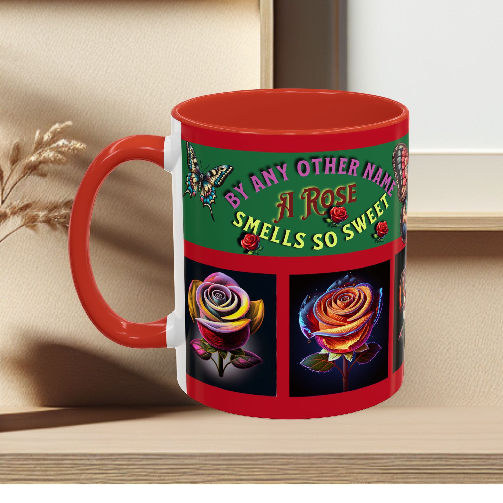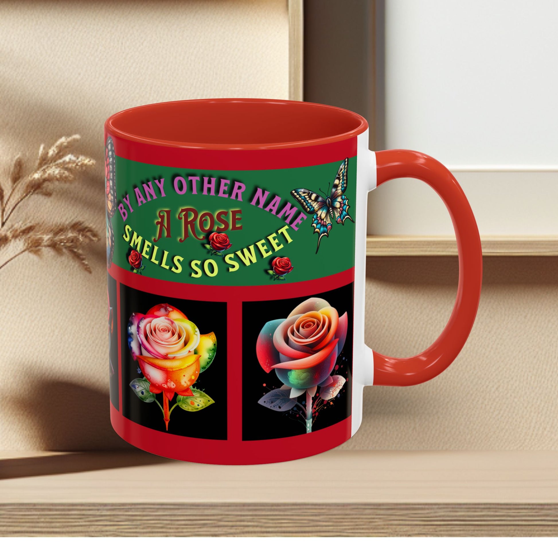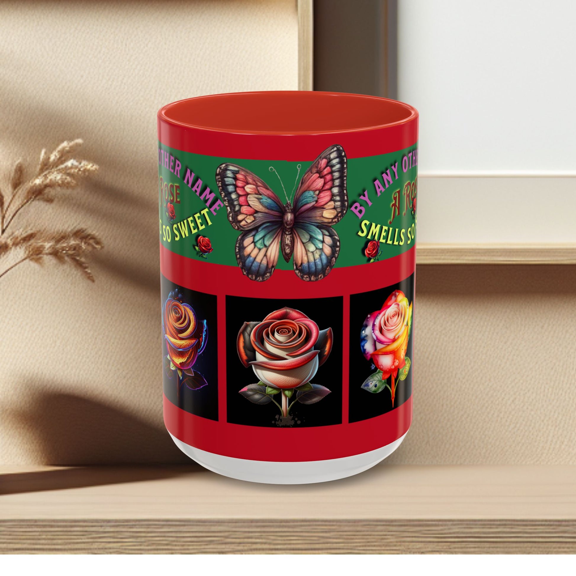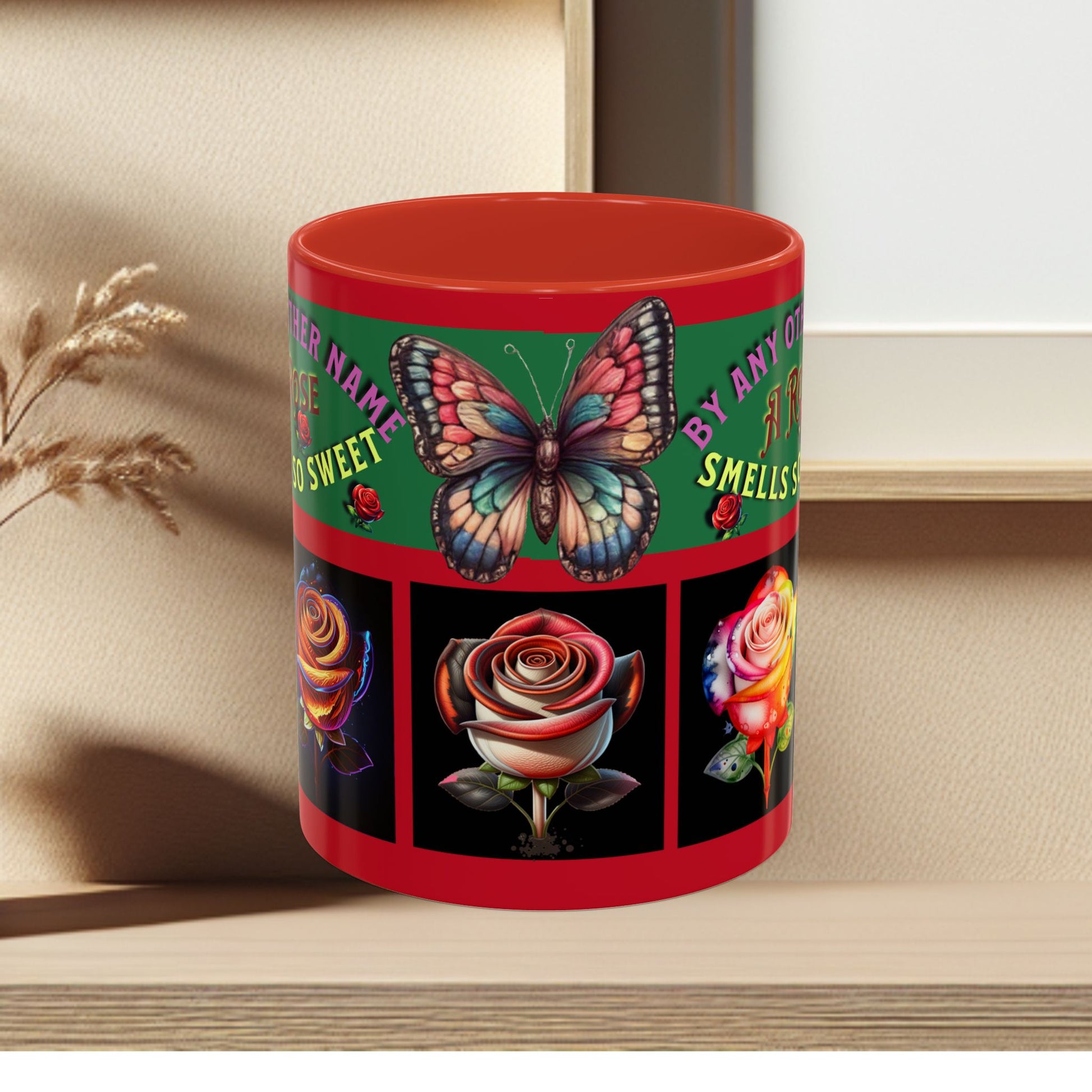 Red Mug - Floral Butterfly Accent Coffee Mug - 'By Any Other Name A Rose Smells So Sweet'