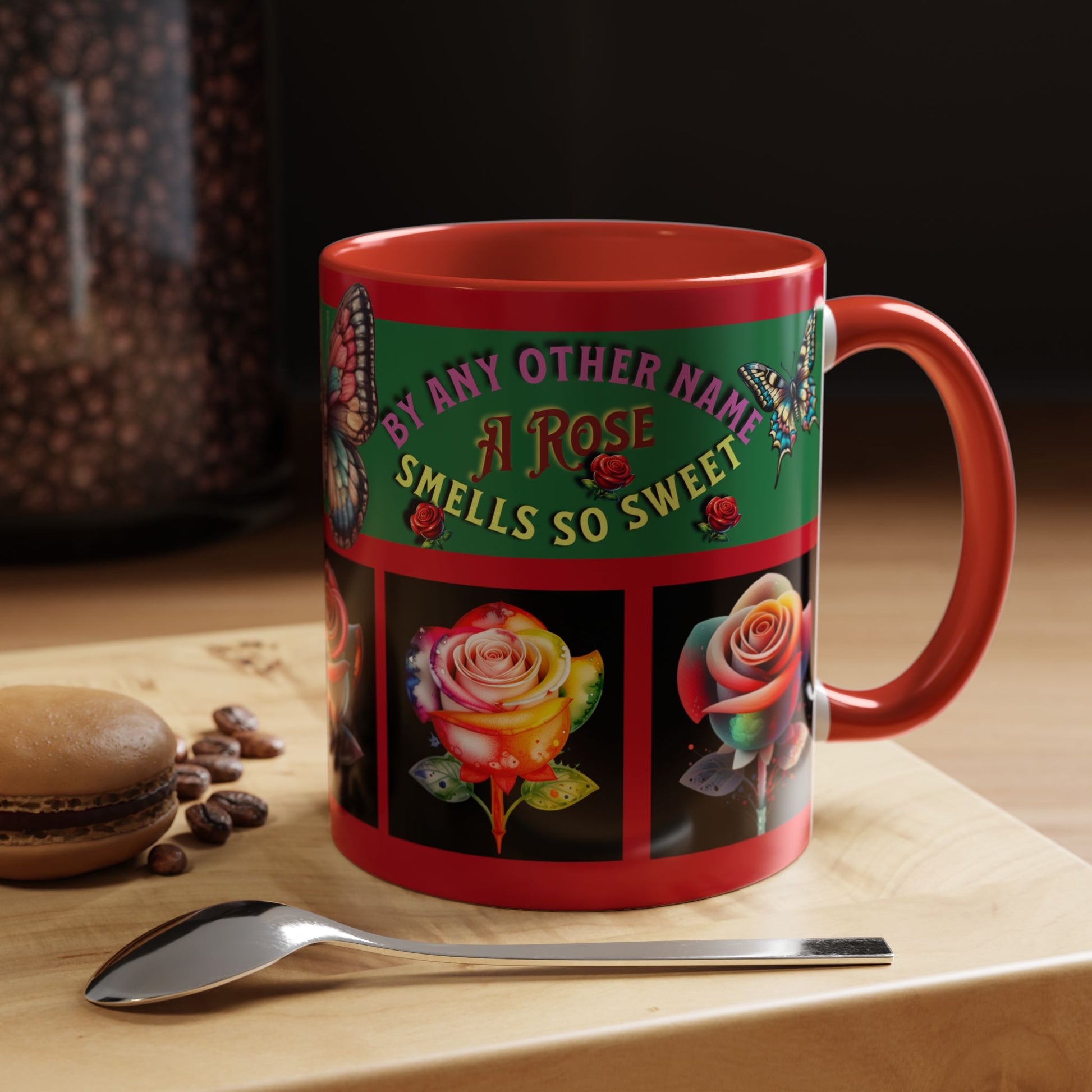 Floral Butterfly Accent Coffee Mug with the quote 'By Any Other Name A Rose Smells So Sweet'. This mug exudes a delicate and cheerful vibe, perfect for enjoying your morning coffee or tea. Ideal for nature lovers, garden enthusiasts, and anyone who appreciates floral designs. Great for Valentine's Day, Mother's Day, birthdays, and any special occasion.