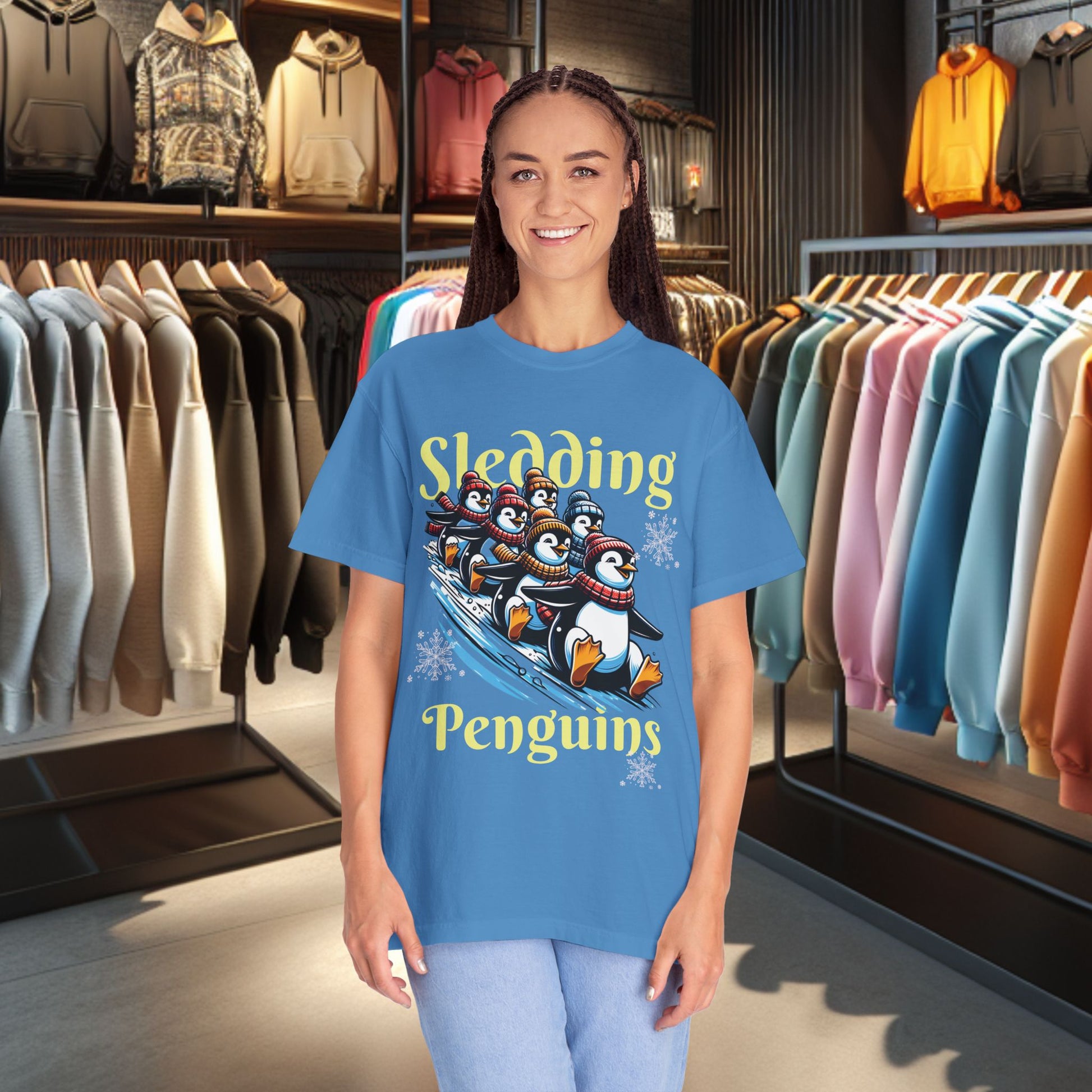 This Sledding Penguins T-shirt brings a festive and playful vibe perfect for the holiday season. With cute penguins having fun in the snow, this garment is cozy and fun. It is ideal for both men and women looking for a festive top to wear during winter celebrations.