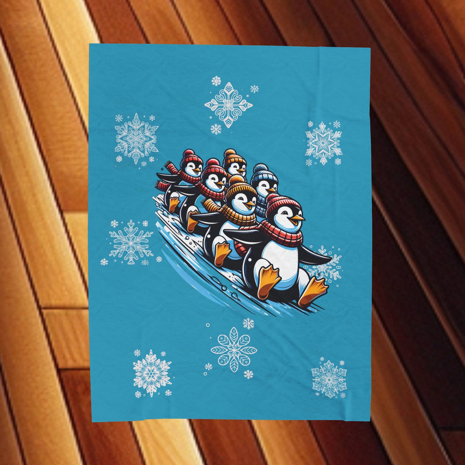 This Sledding Penguins Velveteen Plush Blanket exudes warmth and coziness, perfect for snuggling up on a cold winter night. Ideal for adults looking for a fun and playful addition to their home decor. A great gift for Christmas, birthdays, or any occasion.
