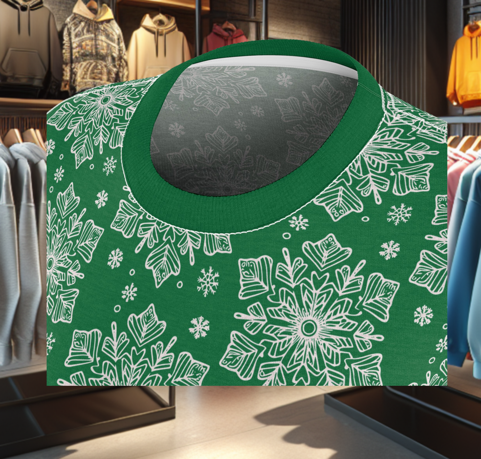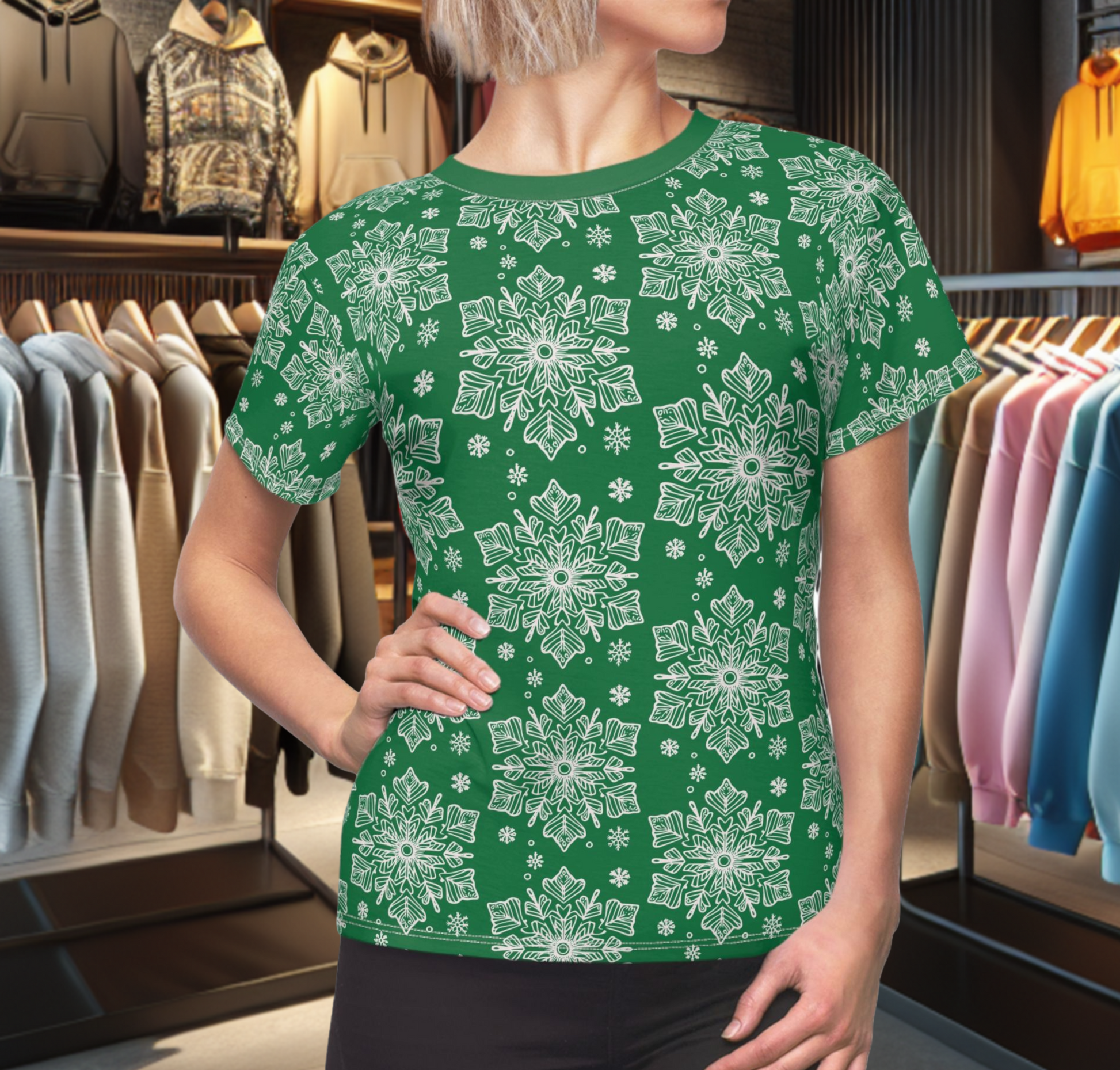 This festive Green tee brings winter warmth without the bulk. Soft-feeling polyester holds a crisp snowflake pattern across the bodice, so each swirl and flake stays bright through washes and wear. Lightweight enough for layering under a cardigan or jacket, it also stands on its own for holiday markets and evening strolls. The ribbed collar and shoulder tape keep the silhouette neat, while side seams create a flattering, structured fit that moves with you. Wear it to a cozy cocoa night, a caroling walk, or a low-key family gathering — it reads cheerful and handcrafted, not overdone.