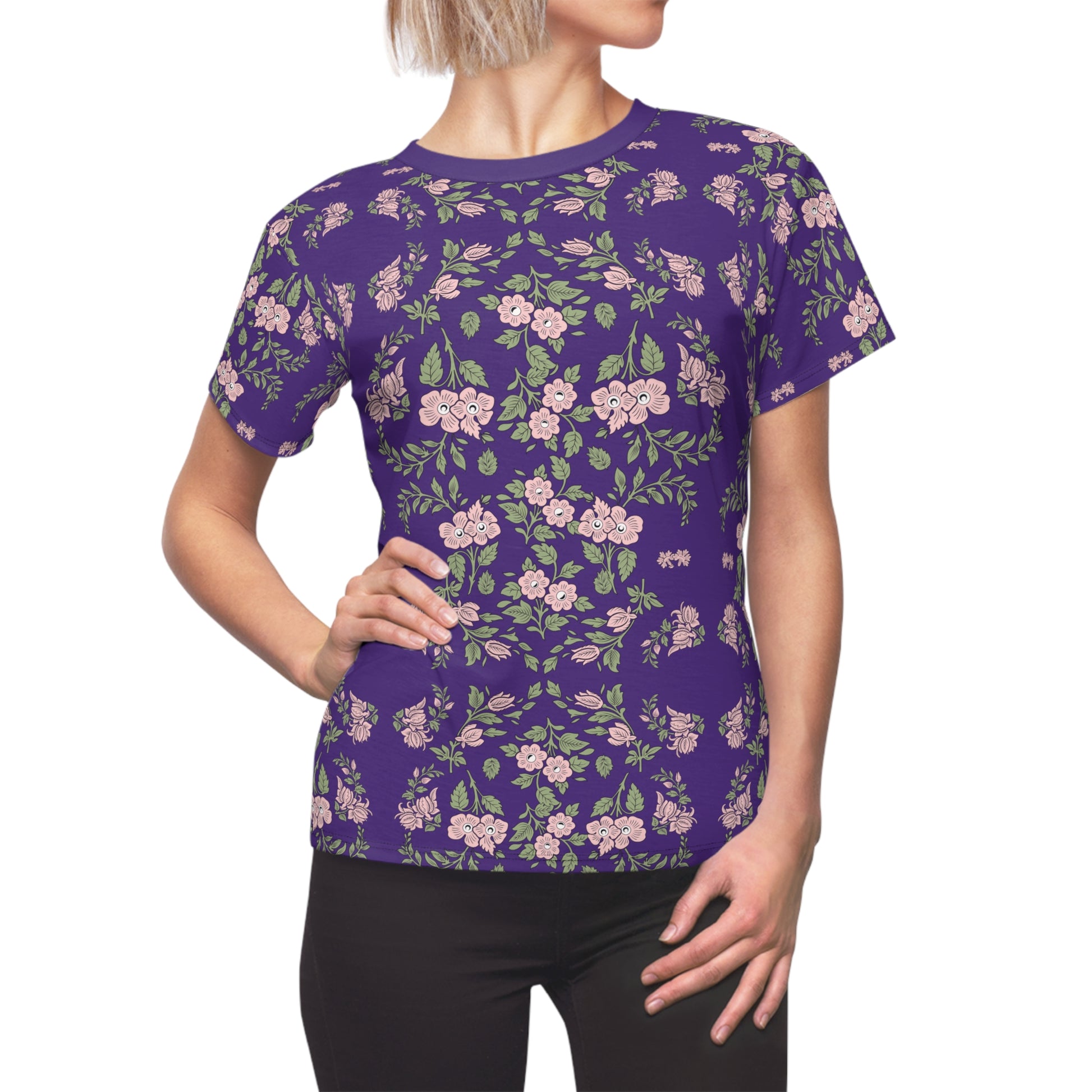 This Women's Tee in Purple with a pink floral print exudes a chic and stylish vibe, perfect for everyday wear or special occasions. Ideal for women looking to add a pop of color and floral accents to their wardrobe. Great for Valentine's Day, Mother's Day, birthdays, and casual outings.